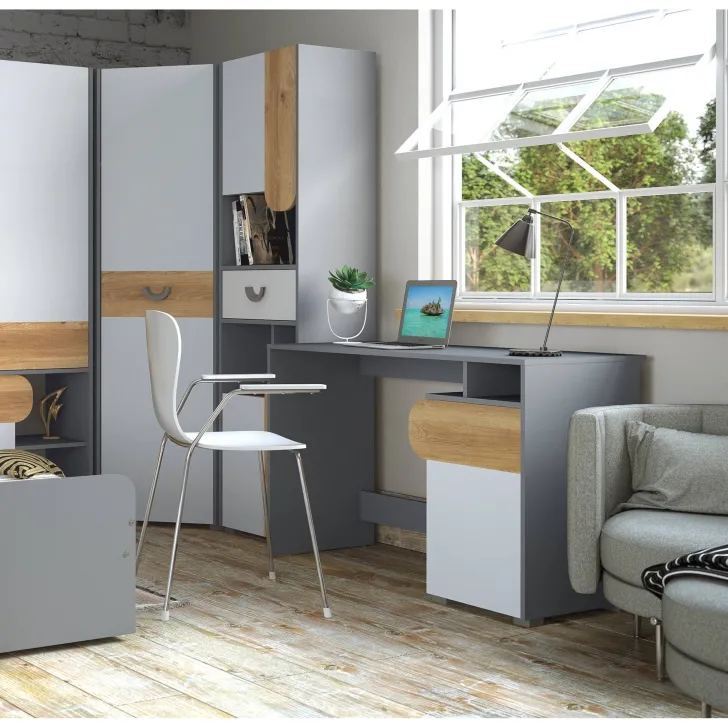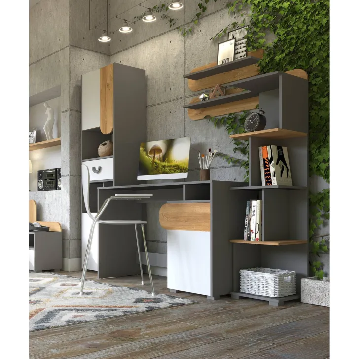 Biurko Carina Dąb Nash / biały / jasny grafit jest odpowiedzią na potrzeby użytkowników, którzy cenią sobie ergonomię, funkcjonalność i estetykę. Stworzony z myślą o młodzieży i biurze, ten mebel potrafi przekształcić każde pomieszczenie w komfortowe miejsce do pracy i nauki.