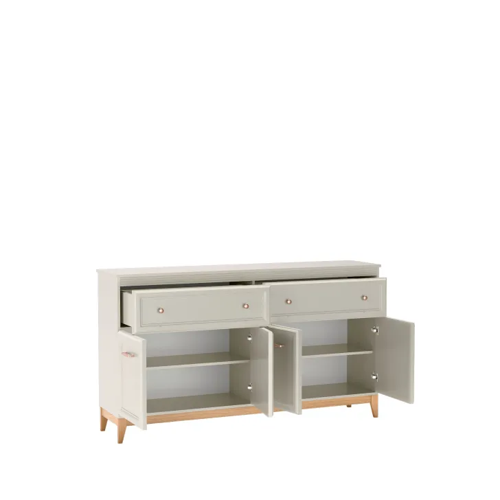 Partia długa komoda DUBAI 2 pozostała zaprojektowana z myślą o harmonii i wyważonej elegancji. Doskonale komponuje się zarówno w klasycznych, jak i nowoczesnych aranżacjach wnętrz. Ciepło naturalnego drewna zestawione z odcieniem kaszmir nadaje jej lekkości, a dekoracyjne listwy MDF na frontach dodają klasycznego uroku. Ponadto, stylowe uchwyty w kolorze miedzi subtelnie podkreślają jej charakter.