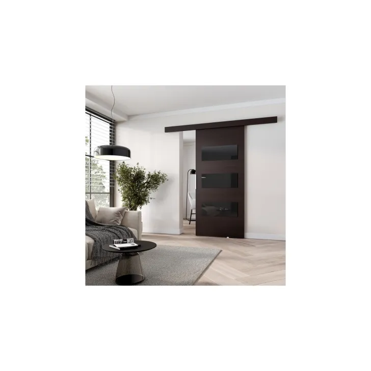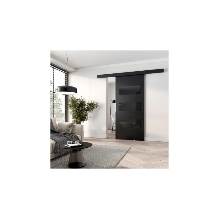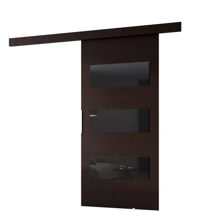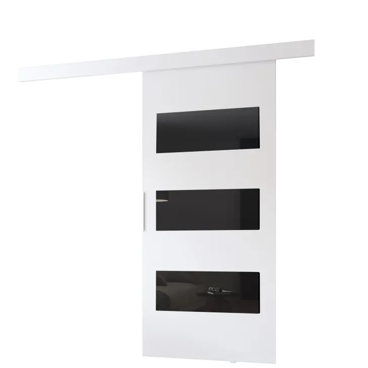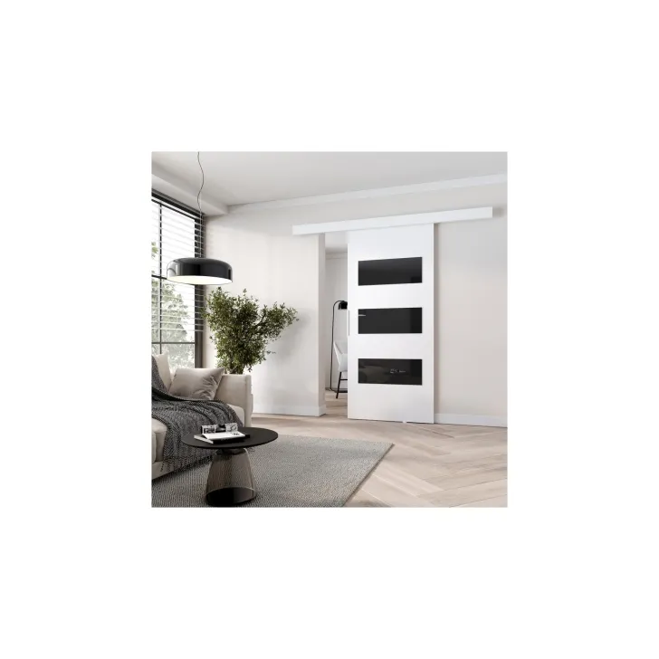 Dostępne w szerokiej gamie kolorów i wzorów, te drzwi przesuwne są wyborem dla każdego, kto szuka indywidualności. Ich front zostaje udekorowany eleganckimi czarnymi panelami ozdobnymi (szkło lacobel), które nadają im wyrafinowanego wyglądu.