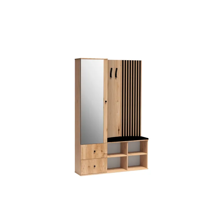 Wymiary Garderoby "MALI" 129 cm, z lustrem i tapicerowanym siedziskiem, kolor dąb Artisan: