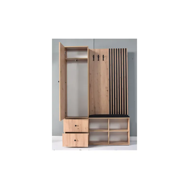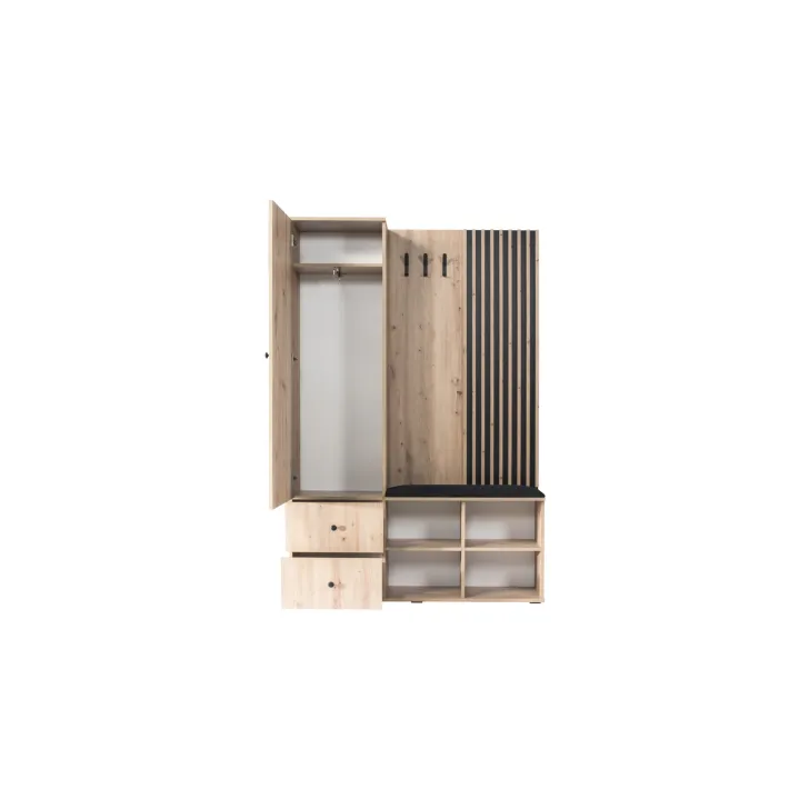 Garderoba "MALI" to dzisiejszy hit w świecie mebli, łączący w sobie styl loftowy z praktycznością. Znakomicie dopasuje się do nowoczesnych przestrzeni i doda im niepowtarzalnego charakteru. Garderoba, wykończona w modnym kolorze dąb Artisan, jest uzupełniona o efektowne czarne dodatki, które dodają jej eleganckiego wyglądu.