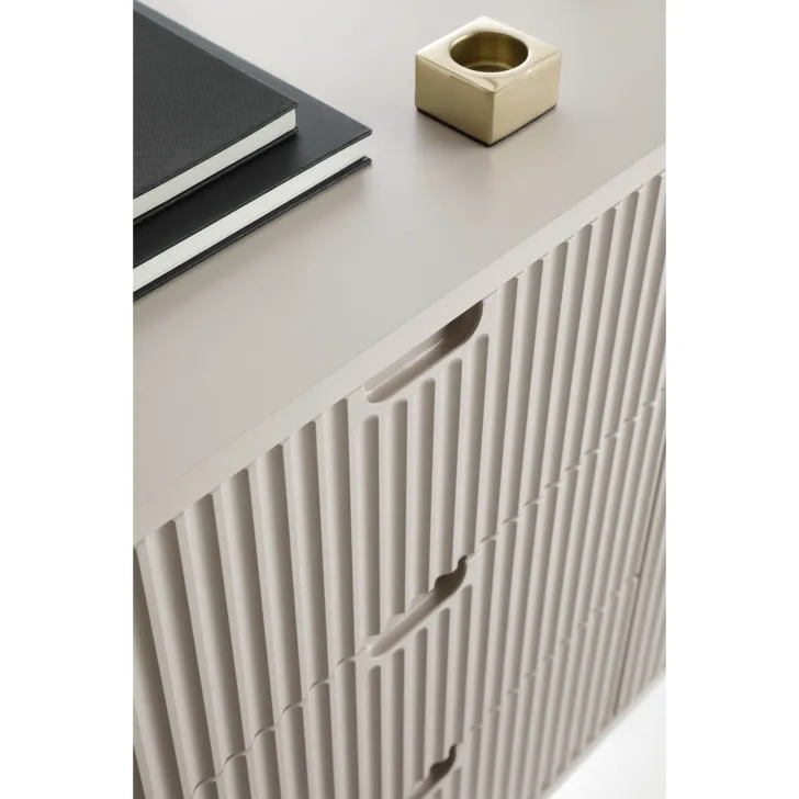 • Posiada ryflowane fronty z płyty 3D MDF, które dodają wnętrzom nowoczesnego charakteru.