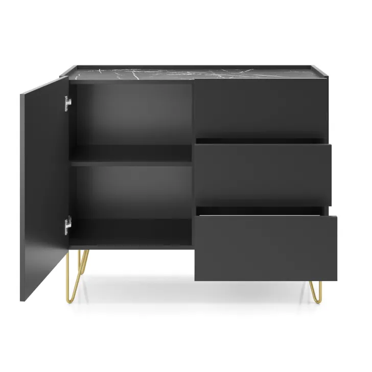 Stylowy, funkcjonalny, elegancki krajobraz designu. Przedstawiamy Komodę "HAGA" o szerokości aż 97 cm, zaprojektowaną z myślą o wszystkich, którzy pragną wprowadzić do swojego wnętrza chwilę luksusu, jednocześnie nie rezygnując z praktyczności. Idealna zarówno do sypialni, salonu czy pokoju dziecka - przestrzeń do przechowywania zwiększa jej funkcjonalność, a staranny dobór materiałów gwarantuje długowieczność i wygodę w użytkowaniu.