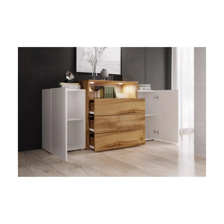 Komoda Korfu III oferuje optymalne wykorzystanie dostępnej przestrzeni zarówno w mniejszych, jak i większych pomieszczeniach. Solidna konstrukcja oraz nowoczesne rozwiązania techniczne zapewniają wytrzymałość i trwałość mebla, gwarantując jego długotrwałe użytkowanie. Wysoka jakość wykonania, zabezpieczone krawędzie oraz możliwość zamówienia oświetlenia LED sprawiają, że komoda jest nie tylko funkcjonalna, ale także stylowym elementem wyposażenia salonu.