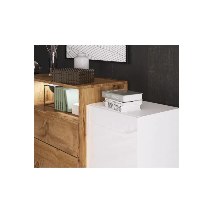 Komoda do salonu KORFU III to eleganckie i funkcjonalne rozwiązanie, które doskonale odnajdzie się w nowoczesnym wnętrzu. Wykonana z trwałej płyty laminowanej o grubości 15mm, kombinuje kontrastujące odcienie drewna wotan i betonu, dodając wnętrzu loftowy charakter. Fronty w kolorze białym z wysokim połyskiem nadają meblowi subtelnej elegancji i sprawiają, że komoda prezentuje się niezwykle efektownie, stanowiąc wyraźny akcent dekoracyjny.