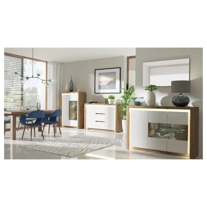 Ważnym atutem komody jest zastosowane oświetlenie LED, które nadaje jej dodatkowy blask i elegancji. Podświetlone białe fronty dodadzą blasku i wyrazistości w każdym pomieszczeniu i z pewnością zachwycą Twoje gości.