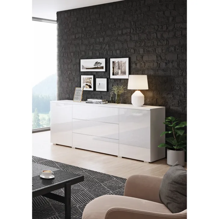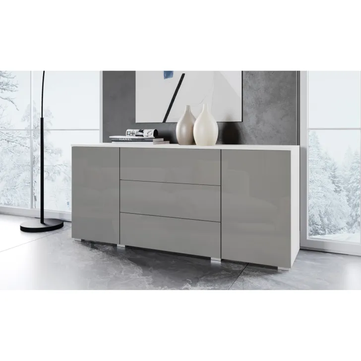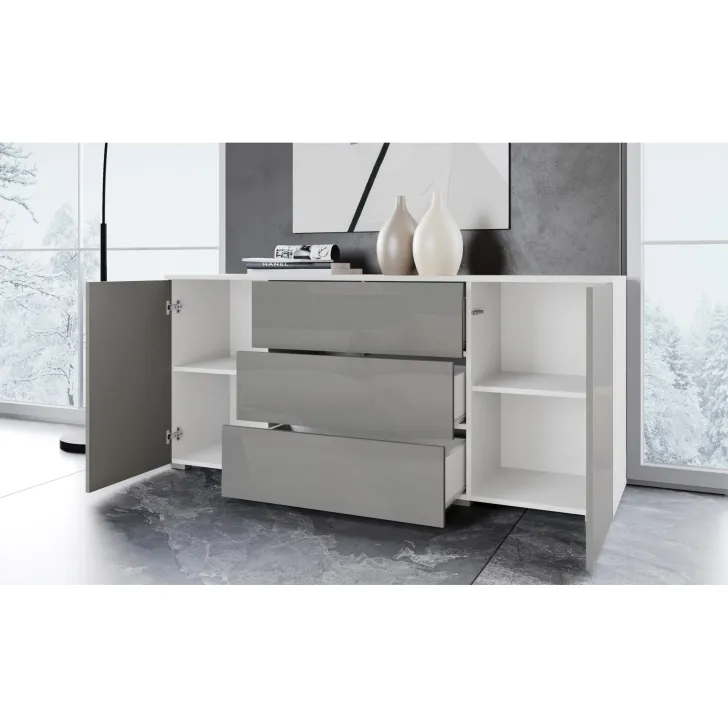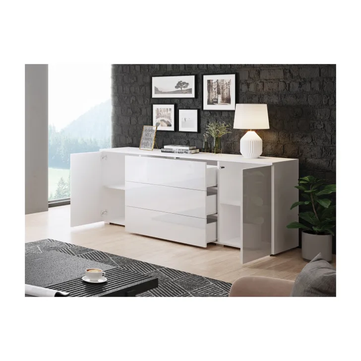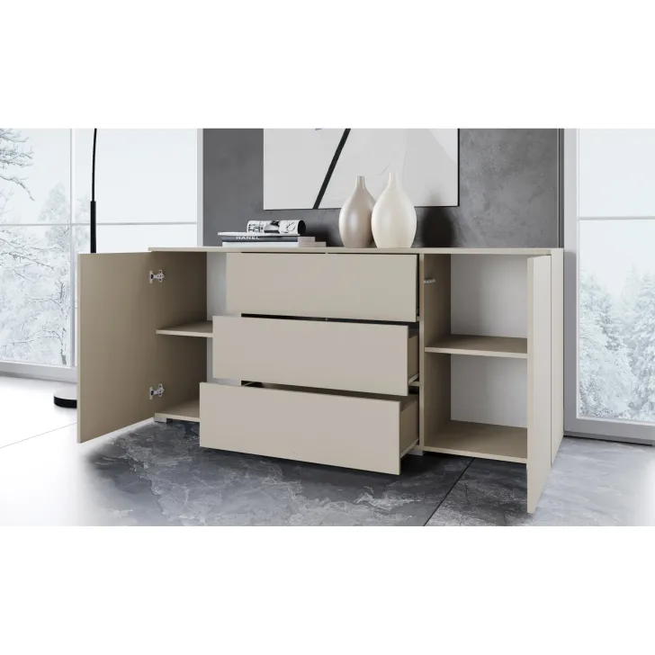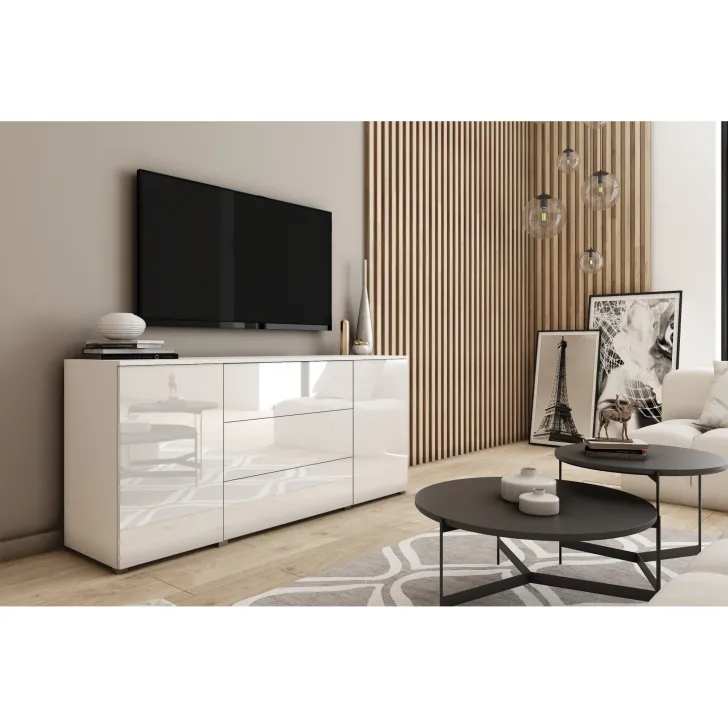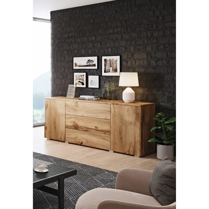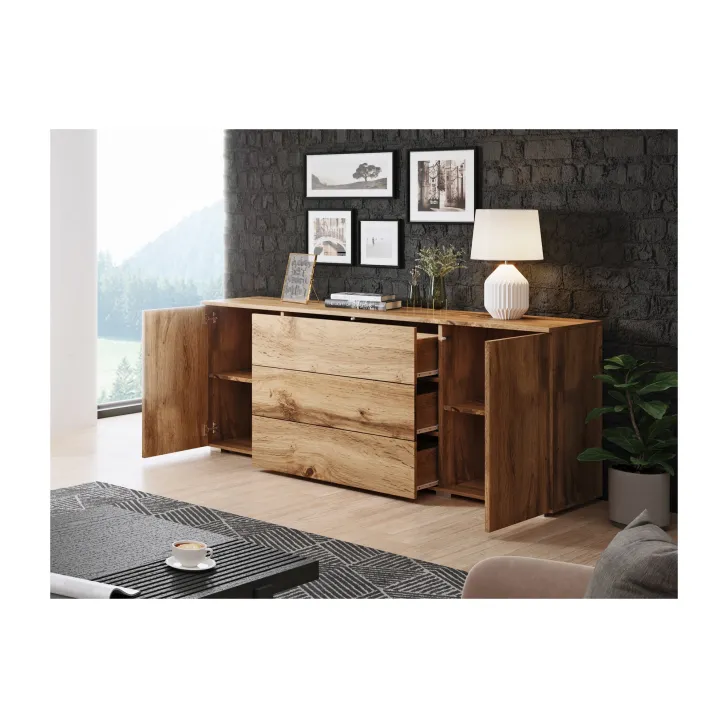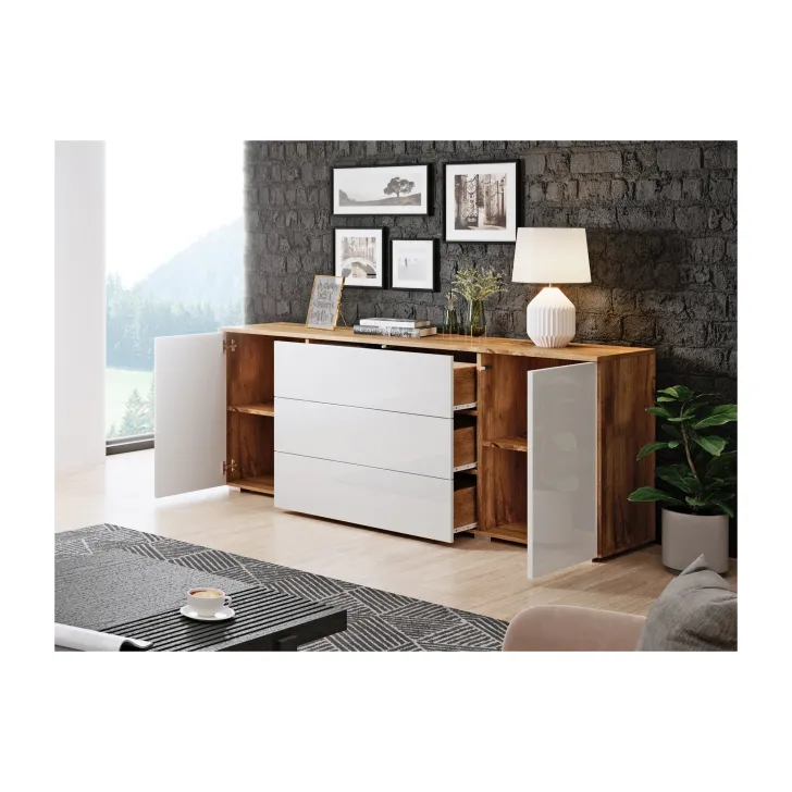 Komoda posiada dwie otwierane szafki z półkami po obu stronach i trzy pojemne szuflady w środkowej części. Dzięki nim z łatwością przechowasz wszystkie niezbędne rzeczy, niezależnie od tego, czy są to ubrania, akcesoria czy inne drobiazgi.