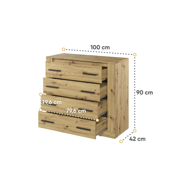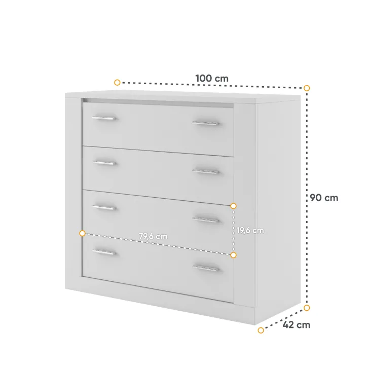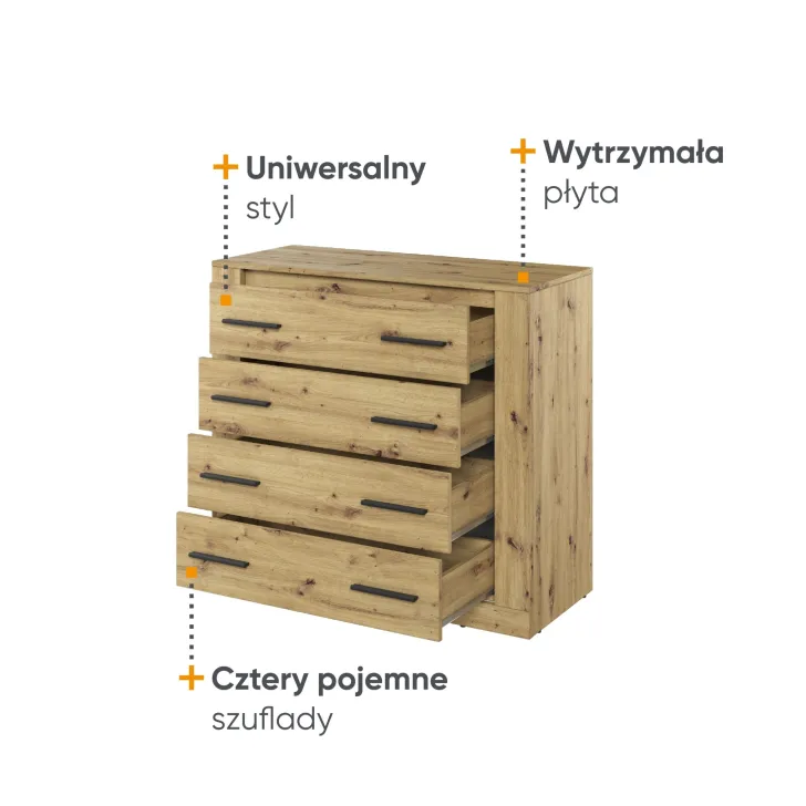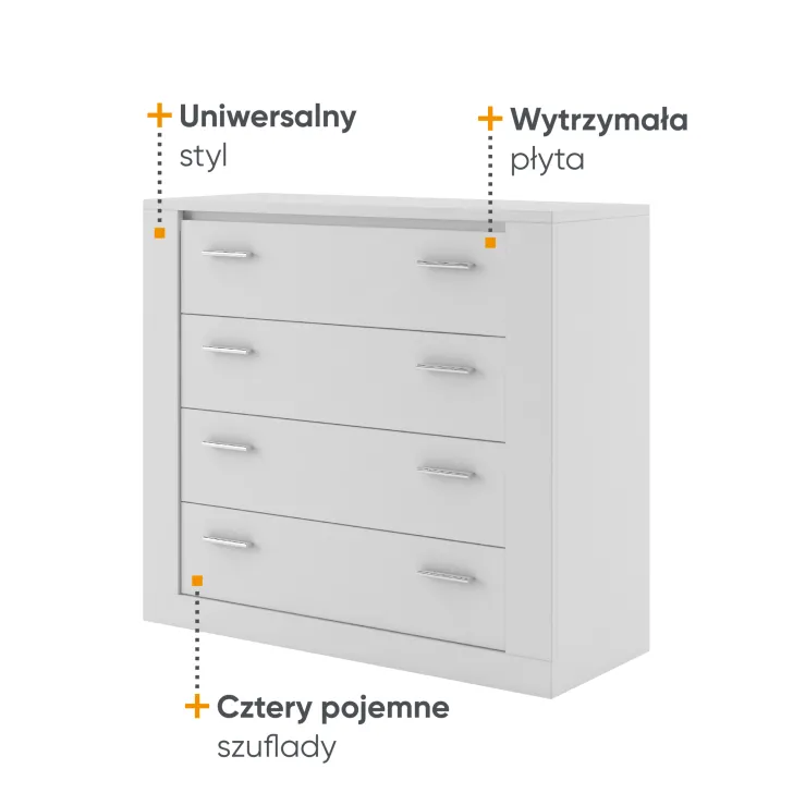 - Praktyczną funkcjonalność: cztery pojemne szuflady zapewniają dużą przestrzeń do przechowywania bielizny, drobiazgów czy dokumentów.