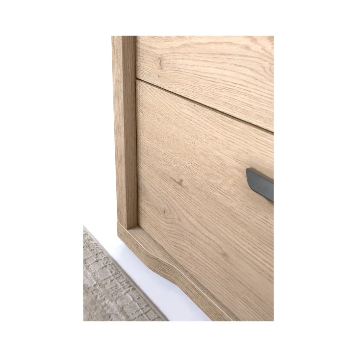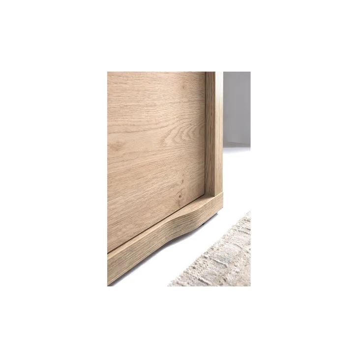 Mebel charakteryzuje się subtelnymi, zaokrąglonymi krawędziami w dolnej części oraz dyskretnymi, metalowymi uchwytami, które doskonale komponują się z naturalną stylistyką kolekcji GIFU. Ciepły odcień dębu cremona oraz delikatna struktura drewna nadaje wyjątkowego uroku, wprowadzając poczucie ładu i harmonii w każde pomieszczenie.