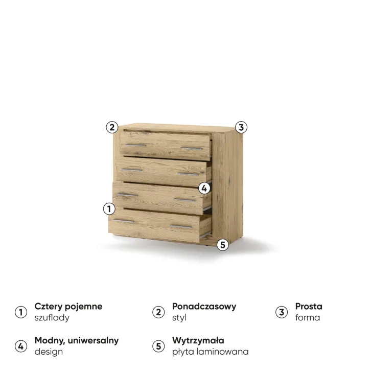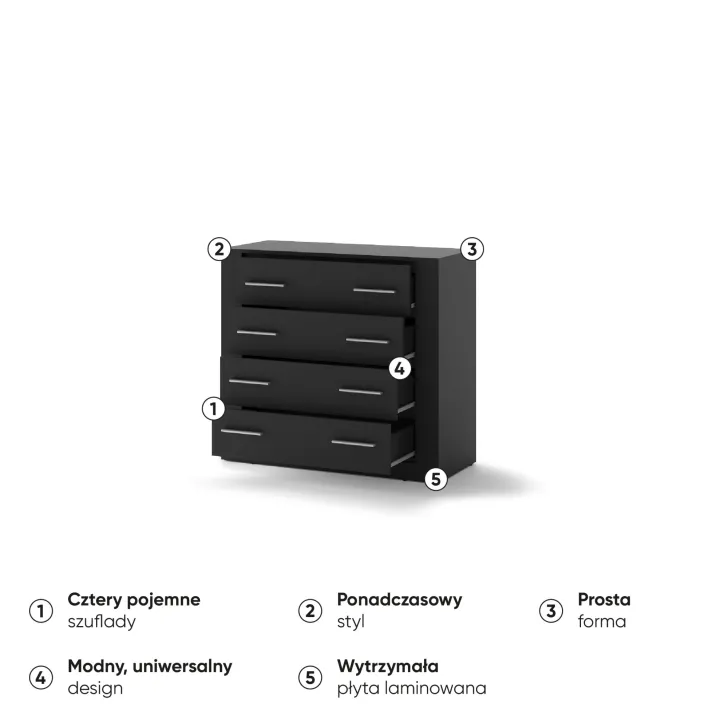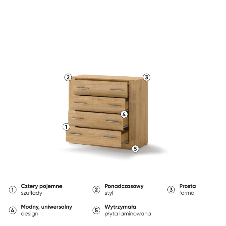 Komoda JADIA 10 to estetyczny i funkcjonalny mebel, który będzie doskonałym uzupełnieniem zarówno dla pokoju jak i salonu. Jej nowoczesny design powstał z myślą o osób, które cenią sobie nie tylko piękno, ale również praktyczność. Dzięki czterem przestronnym szufladom zapewnia miejsce na wiele swoich drobiazgów.
