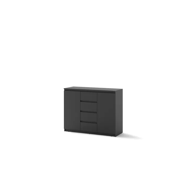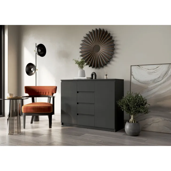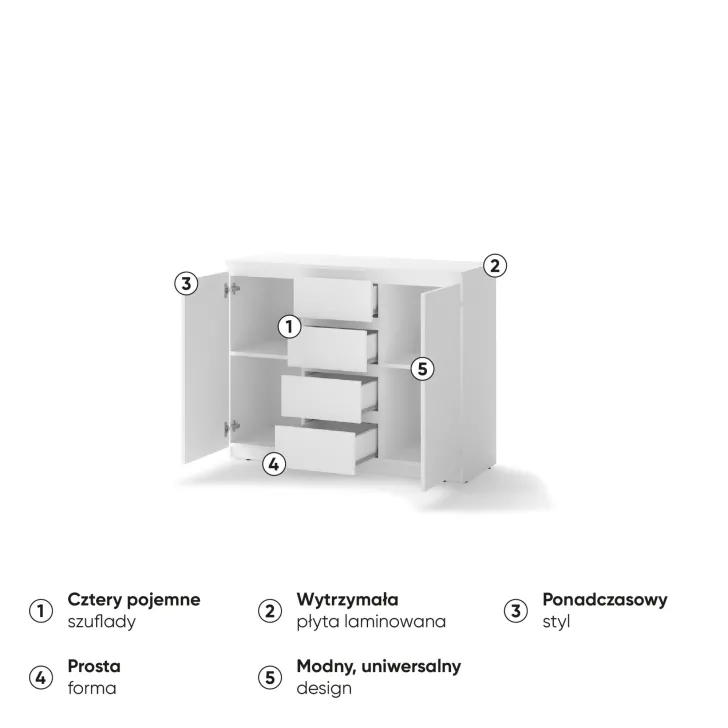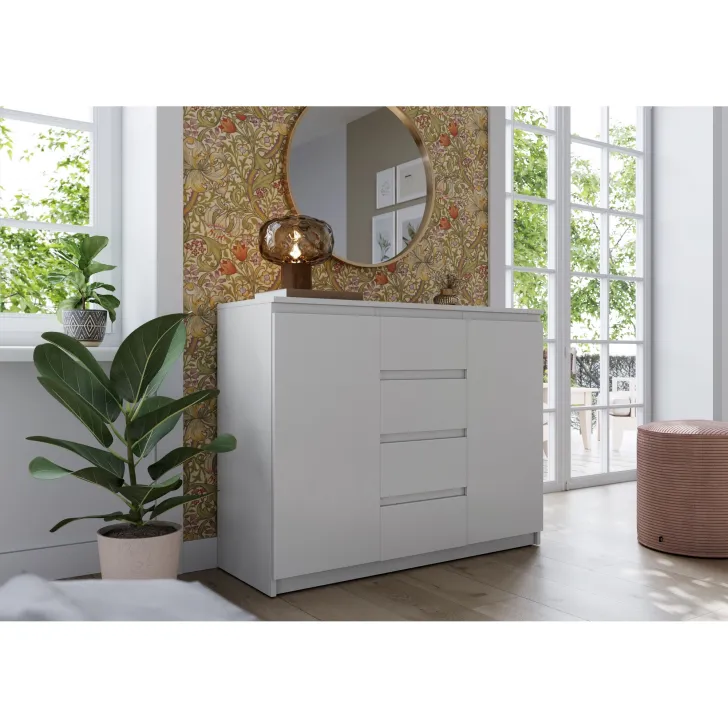 Komoda JADIA 4 stworzona z myślą o wymagających użytkownikach, którzy szukają funkcjonalnych rozwiązań. Łączy w sobie przestrzeń zawartą w czterech pojemnych szufladach oraz dwóch drzwiach, za którymi znajdują się użyteczne półki. Idealnie sprawdzi się do przechowywania dokumentów, ubrań, biżuterii lub innych domowych akcesoriów. Dodatkowo, blat komody to doskonałe miejsce do stawiania ozdób, fotogramów czy innych dekoracji, które podkreślą charakter pomieszczenia.