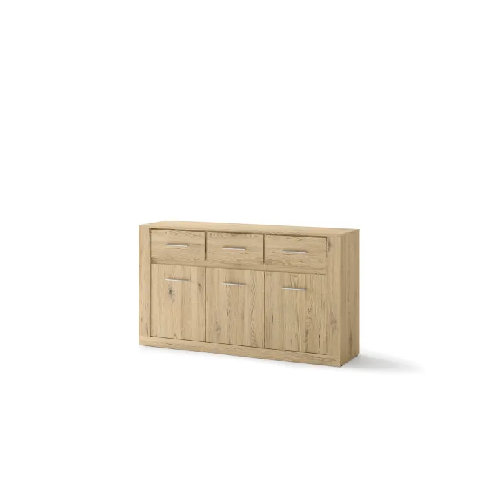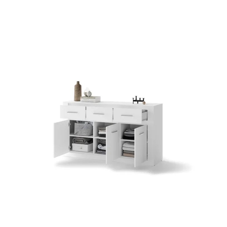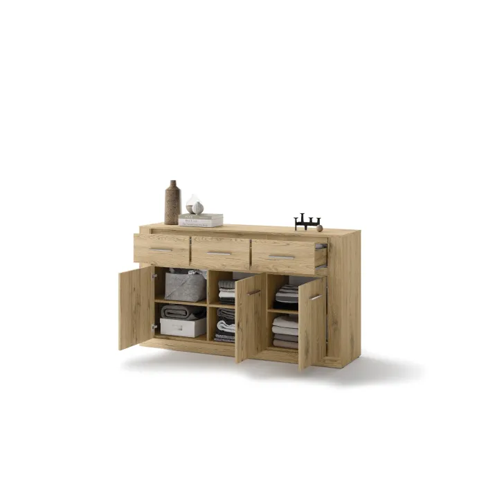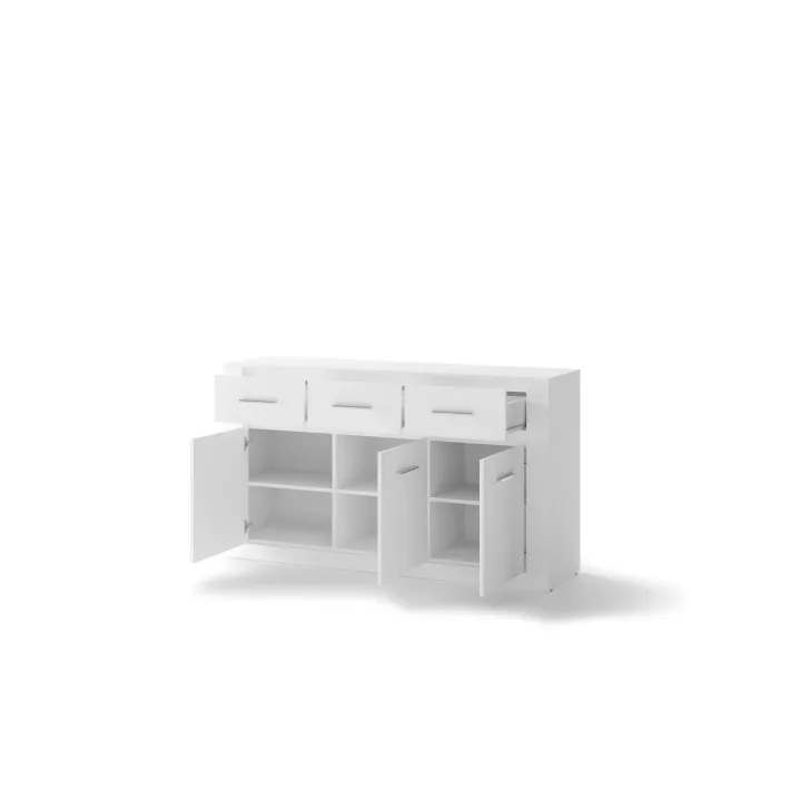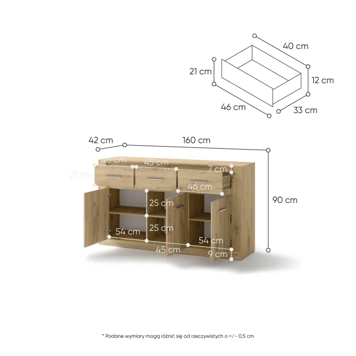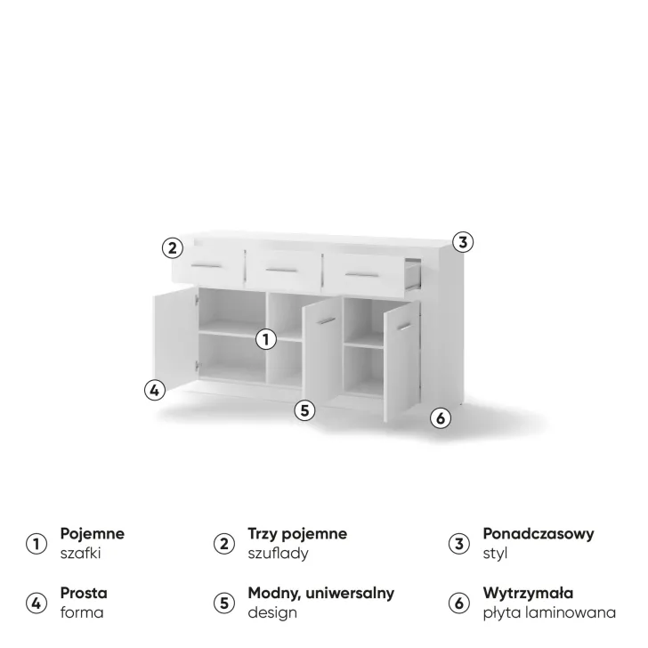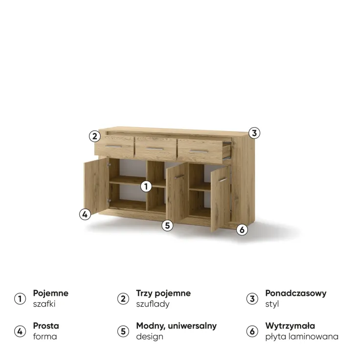 Wyposażona jest w trzy przestronne szuflady i drzwi, za które skrywają dodatkowe półki. Jej uniwersalny design sprawia, że będzie pasować do każdego pomieszczenia - pokoju dziennego, jadalni, sypialni czy salonu. To prawdziwy must have dla tych, którzy cenią sobie funkcjonalność połączoną z nowatorskim stylem.