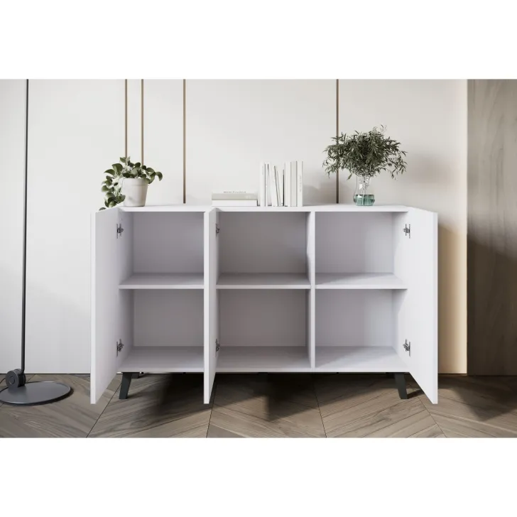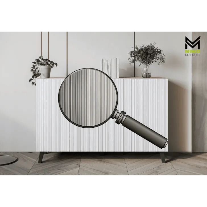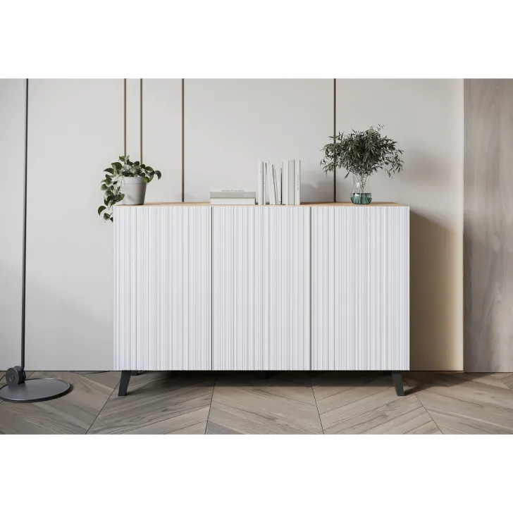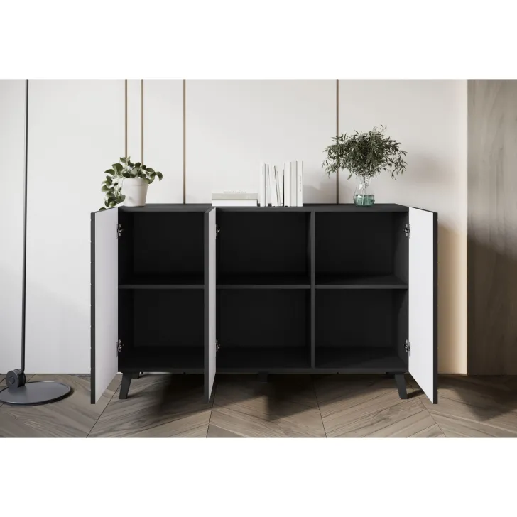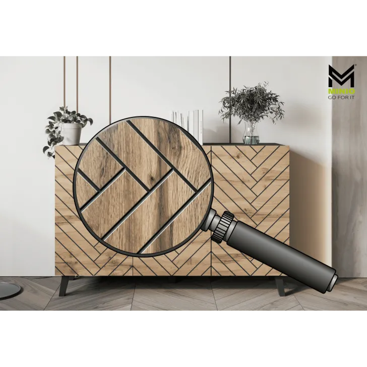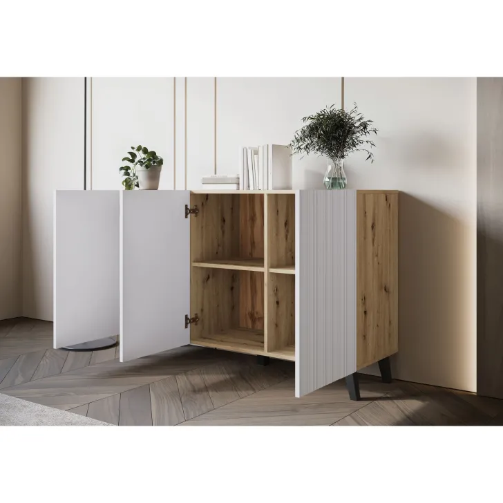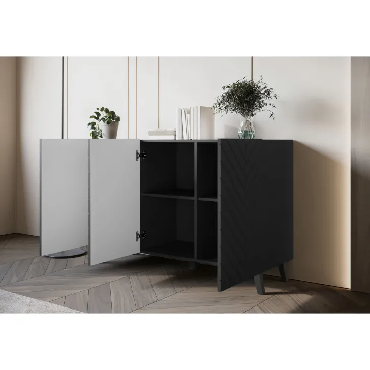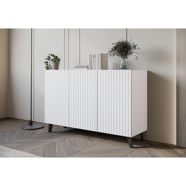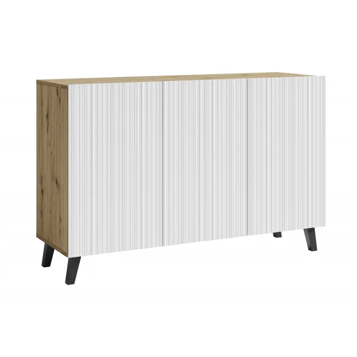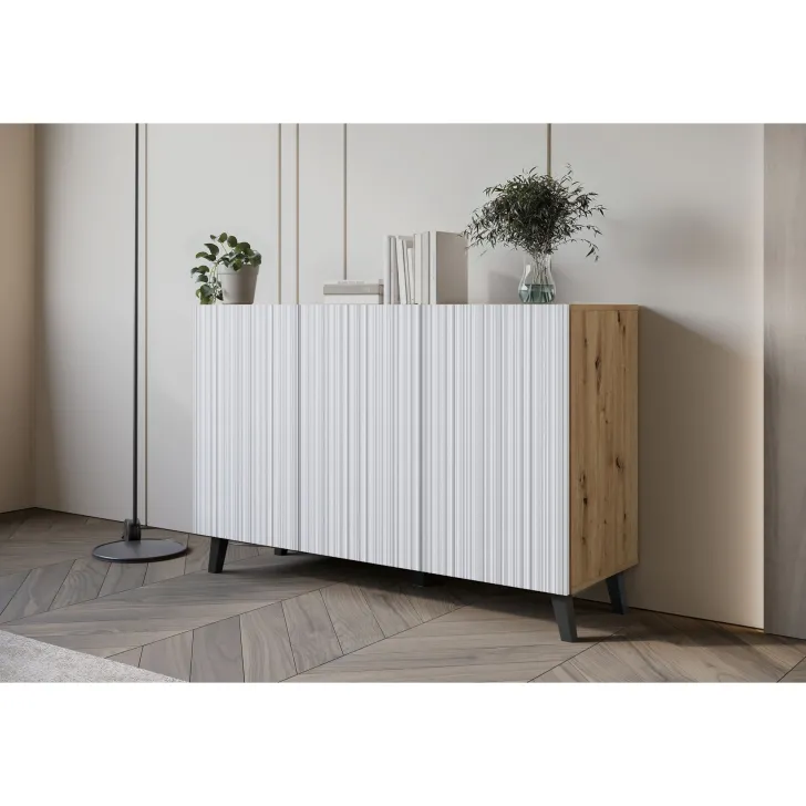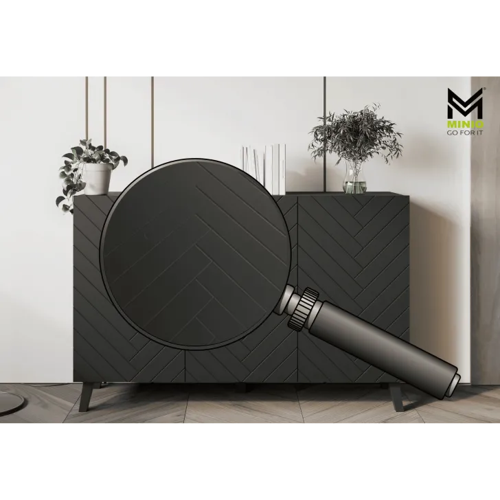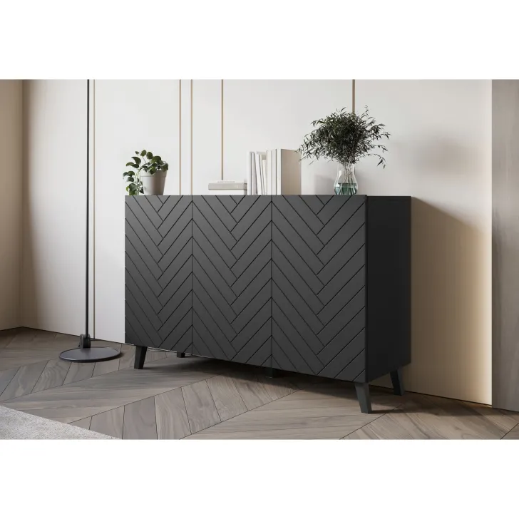Komody w wybarwieniu : czarny z wzorem jodełka; czarny/dąb wota z wzorem jodełka; biały z wzorem ryflowanie pionowe, proste; dąb artisan/biały z wzorem ryflowanie pionowe, slim posiadają nóżki w kolorze czarnym, fronty otwierane za pomocą chwytu za krawędź wystającą poza obrys bryły.