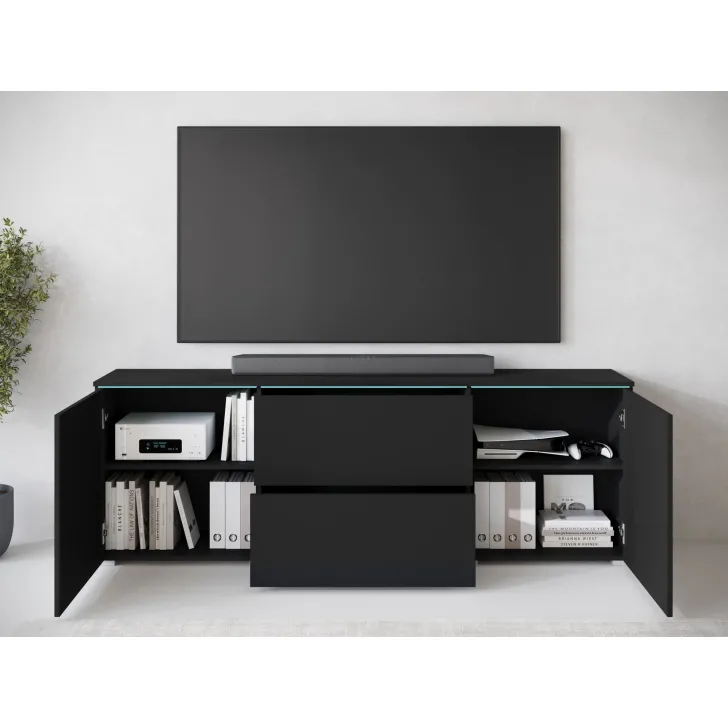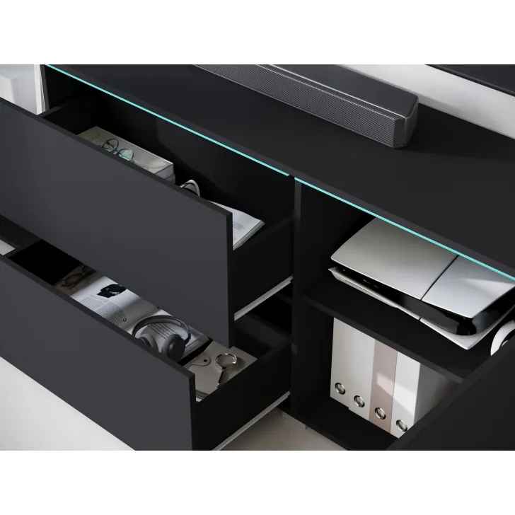 • Wyposażony w dwie przestronne szuflady, a także dwie drzwi, za którymi znajdują się pojemne wnęki przedzielone półkami. Te cechy zapewniają maksymalny komfort użytkowania i umożliwiają przechowywanie wielu przedmiotów.