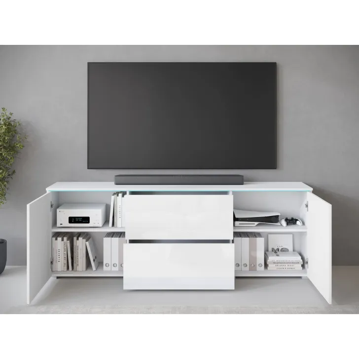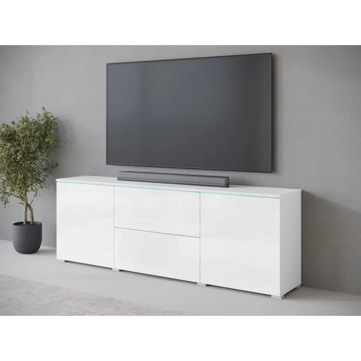 Uszlachetnij swoje wnętrze przy pomocy nowoczesnej, białej komody "VEVE" 180 cm z frontami w połysku.