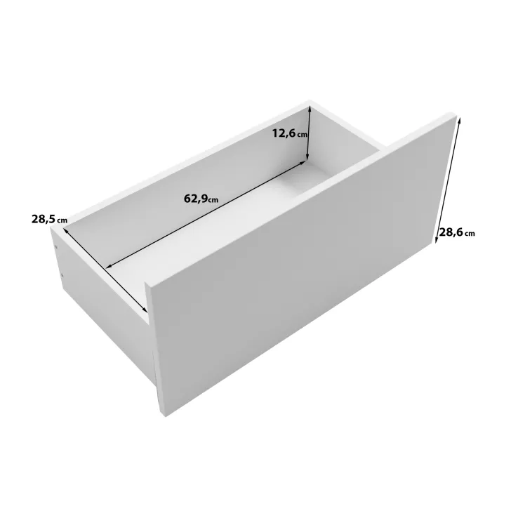 Korpusy komody wykonane są z wysokiej jakości płyty laminowanej o grubości 15mm, co zapewnia jej trwałość na długie lata. Fronty mebla pokryte są płytą polygloss o grubości 15 mm w białym kolorze, co dodatkowo podkreśla elegancki i nowoczesny wygląd komody. Widoczne krawędzie korpusu oklejone są obrzeżem ABS, co gwarantuje trwałość i odporność na uszkodzenia.