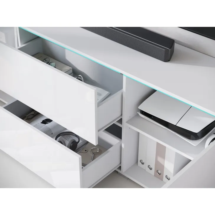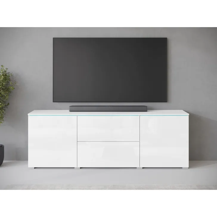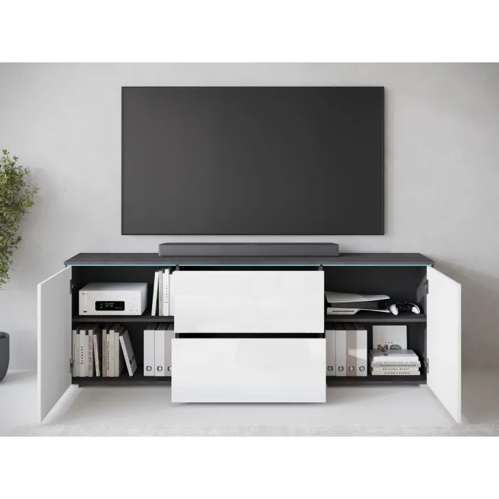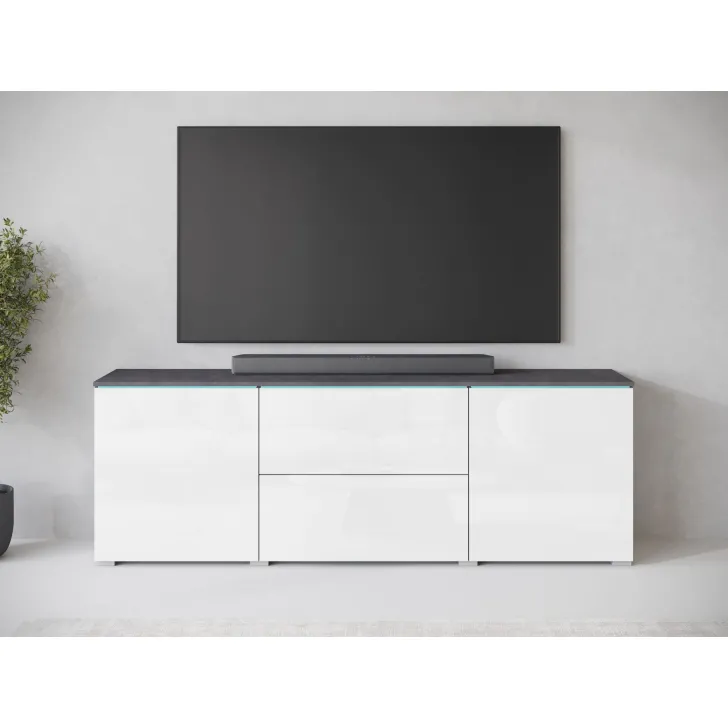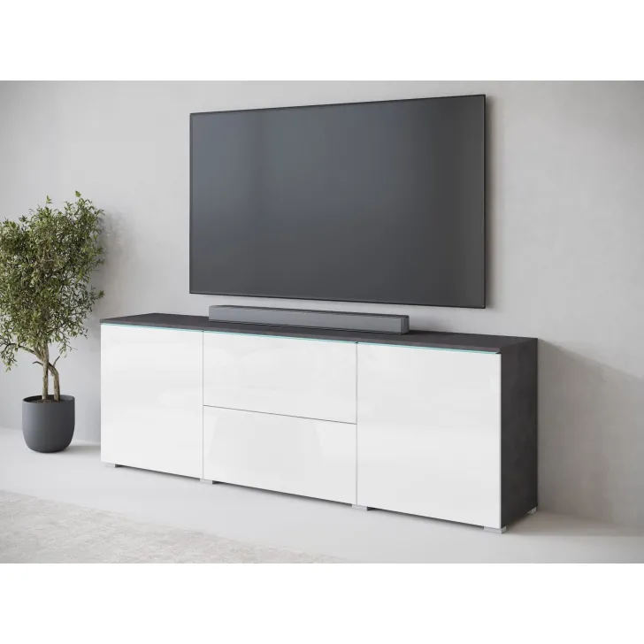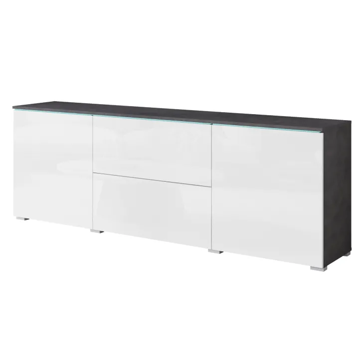 Ta nowoczesna komoda dostępna jest w kolorze biały/biały połysk i Matera/biały połysk, a dodatkowo istnieje możliwość wyposażenia komody w oświetlenie LED dające subtleny, ciepły akcent.