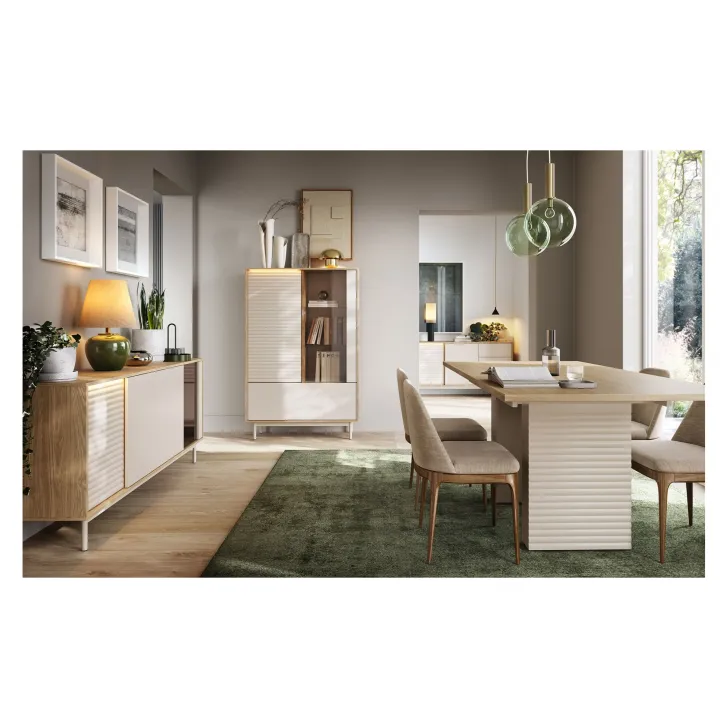Zapoznaj się z najnowszym dodatkiem do naszej kolekcji - Komodą z przeszkleniem LITA 2. Komoda ta to nie tylko praktyczne meble do przechowywania, ale również modnie zaprojektowany kredens do jadalni, który doda stylu każdemu pomieszczeniu. Komoda LITA 2 jest podzielona na dwie części, połączone w jedną harmonijną całość. Pierwszą z nich stanowi przeszklona część, doskonała do wyeksponowania ulubionych dekoracji. Druga część kryje za pełnymi frontami drzwi trzy praktyczne półki, oferując dyskretne miejsce do przechowywania codziennych przedmiotów.