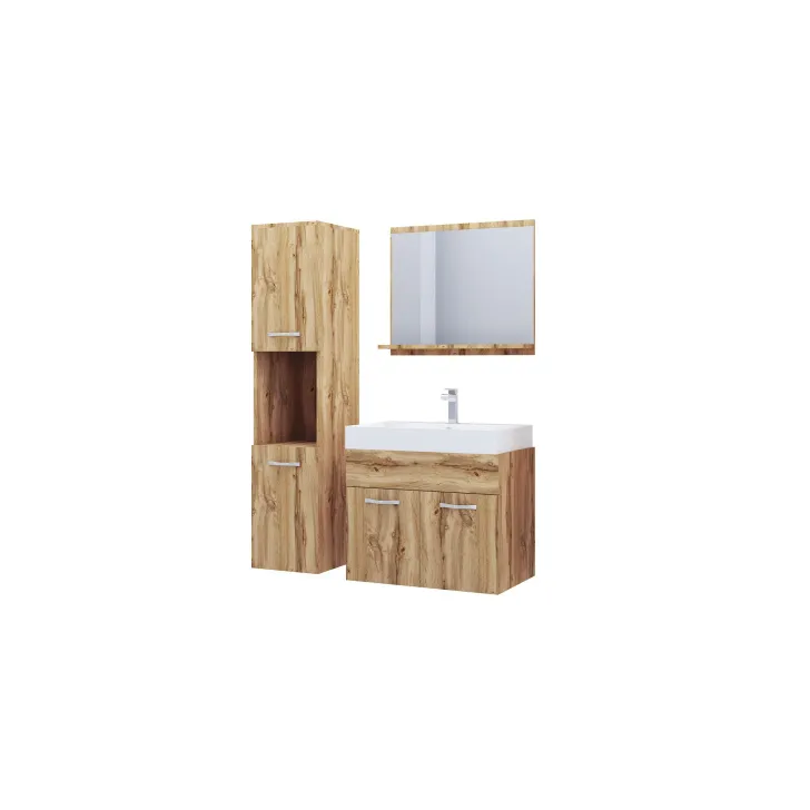 W skład zestawu wchodzą: Komplet mebli łazienkowych,w tym szafka wisząca, szafka pod umywalkę, a także wyjątkowo elegancka umywalka. Szczególną uwagę zwraca wykonanie krawędzi, które pokryte są obrzeżem ABS, co gwarantuje większą odporność na wilgoć - niezbędną w pomieszczeniu jakim jest łazienka. Dodatkowo, wszystkie szafki wyposażone są w metalowe uchwyty, co zdecydowanie podnosi ich funkcjonalność.