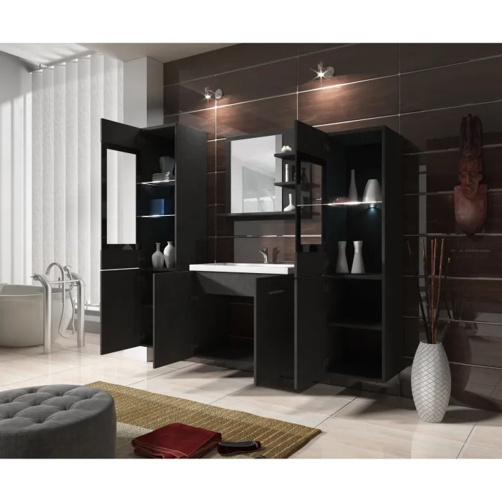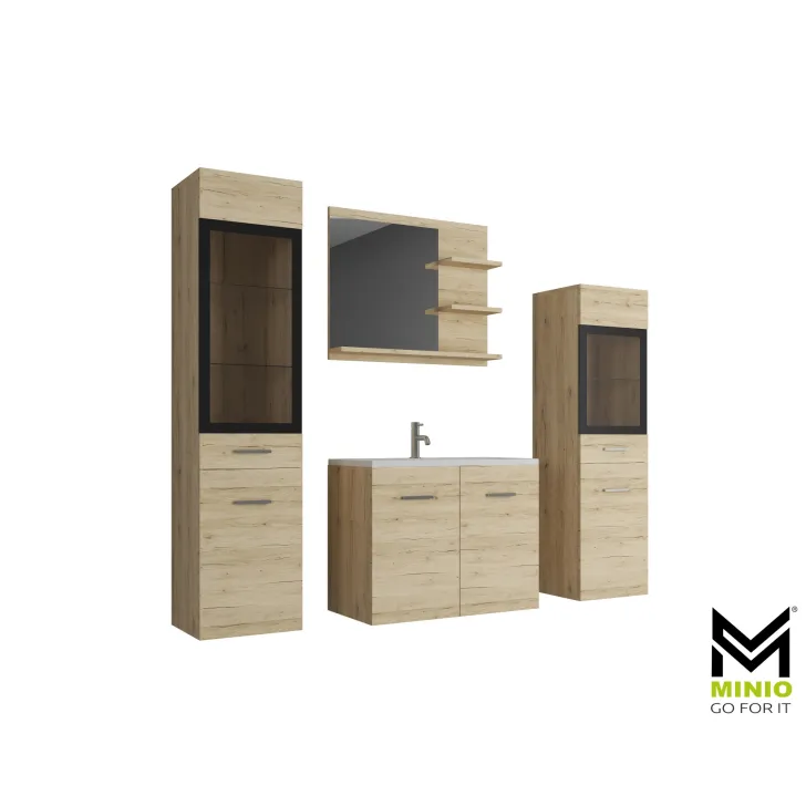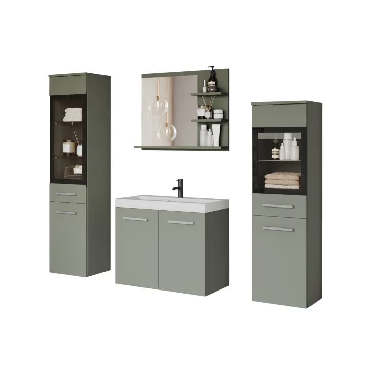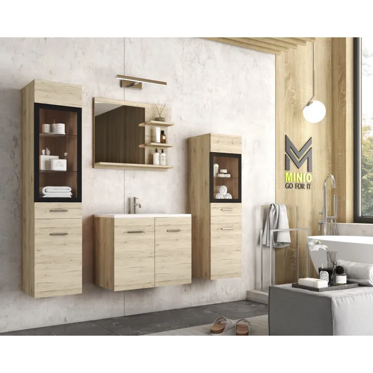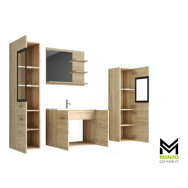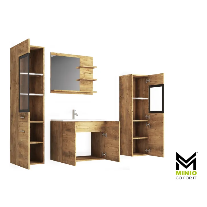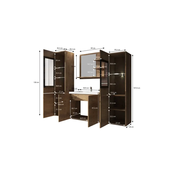 • Funkcjonalność: Zestaw zawiera wszystko, co potrzebujesz w swojej łazience – umywalkę, szafki na kosmetyki i artykuły higieniczne oraz lustro z półkami.