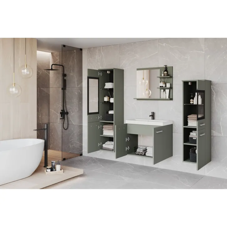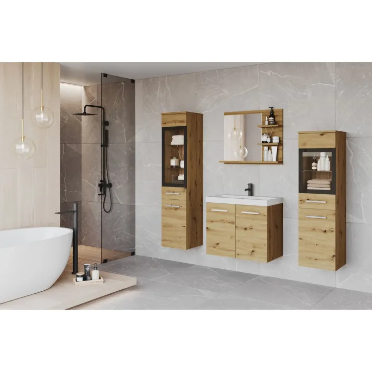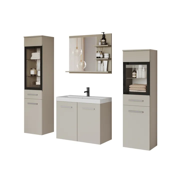 Każdy zestaw mebli łazienkowych Marit 1 zawiera umywalkę wykonaną z trwałego konglomeratu. Ponadto, zestaw wyposażony jest w lustro z praktycznymi półkami, które pomogą utrzymać porządek w Twojej łazience. Dodatkową zaletą są przeszklone fronty witryn bocznych wykonane z częściowo malowanego szkła hartowanego, które nadają meblom lekkości i elegancji, jednocześnie będąc wyjątkowo trwałymi.