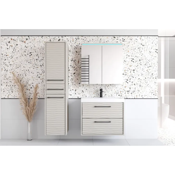 Meble łazienkowe "YUKO" z umywalką to perfekcyjny zestaw, który zapewni Ci eleganckie i funkcjonalne rozwiązanie do Twojej łazienki. Zestaw składa się z wiszących mebli łazienkowych, które cechują się ponadczasowym designem i wysoką jakością wykonania. Meble zostały wykonane z laminowanej płyty meblowej o grubości 15 mm, co gwarantuje trwałość i solidność konstrukcji. Fronty mebli wykonane są z wysokiej jakości płyty MDF 3D, co dodaje im elegancji i stylu.