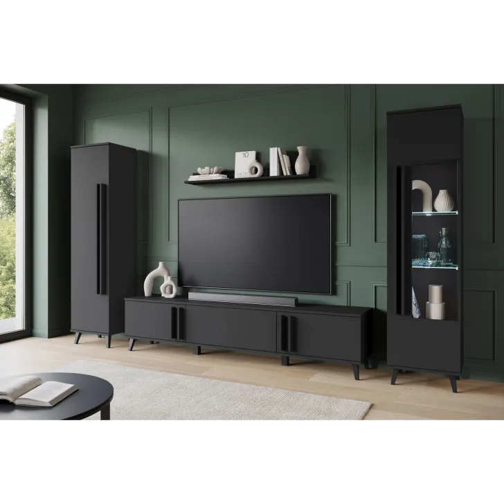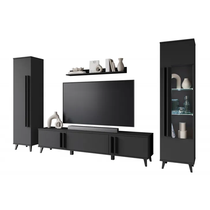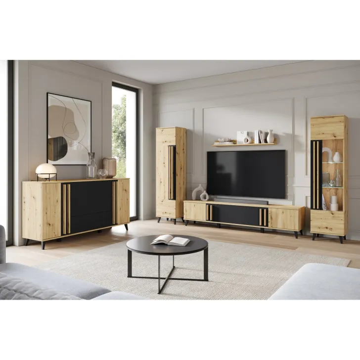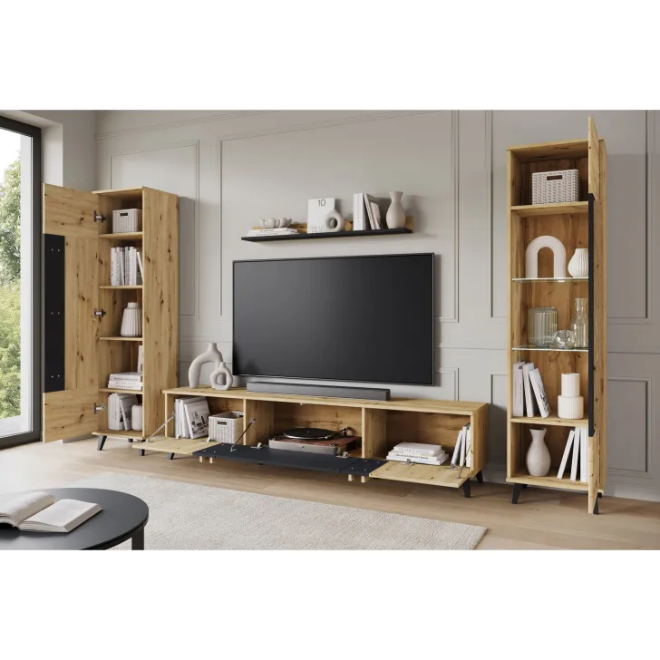 Meblościanka HURON II to idealne rozwiązanie do codziennego użytku, pozwala na pełne zorganizowanie przestrzeni salonu, dodając mu elegancji. Stabilne nóżki zapewniają pewne podparcie dla mebli, a jednocześnie ułatwiają czyszczenie podłogi pod nimi. Istnieje też możliwość zakupu meblościanki z opcjonalnym oświetleniem LED, które doda wnętrzu wyjątkowego klimatu. HURON II oferowany jest w trzech wariantach kolorystycznych: czarny, congo/czarny lub dąb artisan/czarny - wybierz ten, który najlepiej pasuje do atmosfery Twojego salonu.