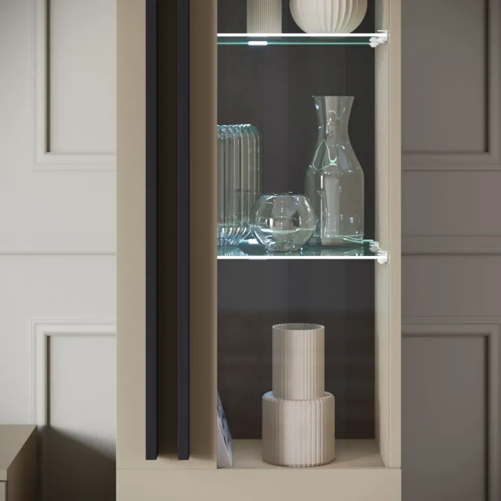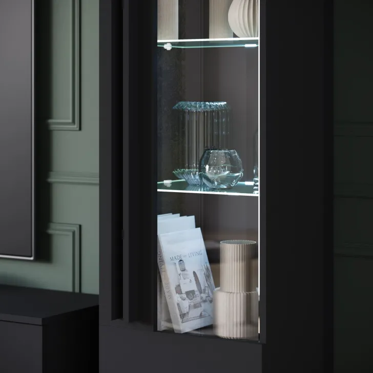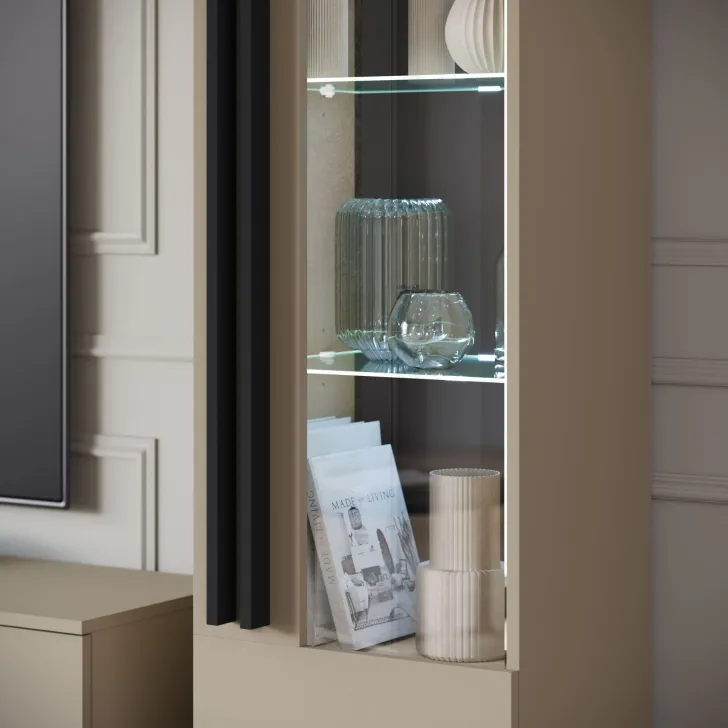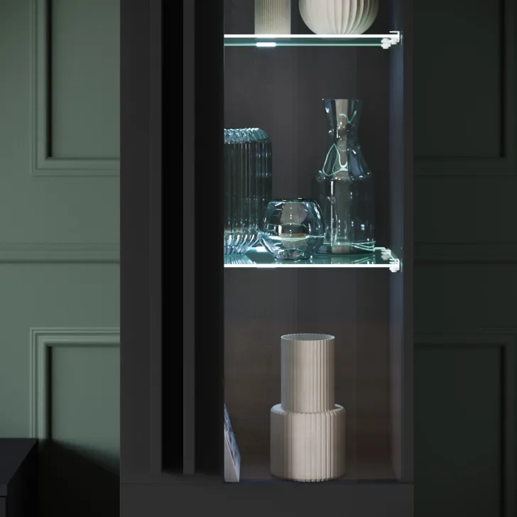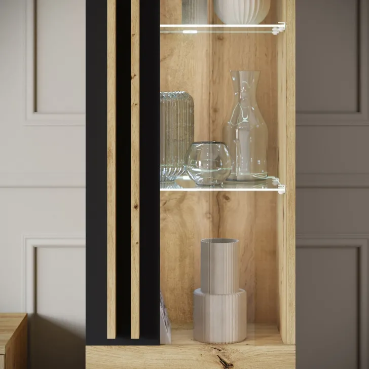 • Witryna z przeszkleniem, za której drzwiczkami znajdują się półki z płyty, doskonałe do przechowywania różnego rodzaju rzeczy. Szklane półki są doskonałym miejscem do wyeksponowania ulubionych dekoracji, zastawy stołowej czy kolekcji książek.
