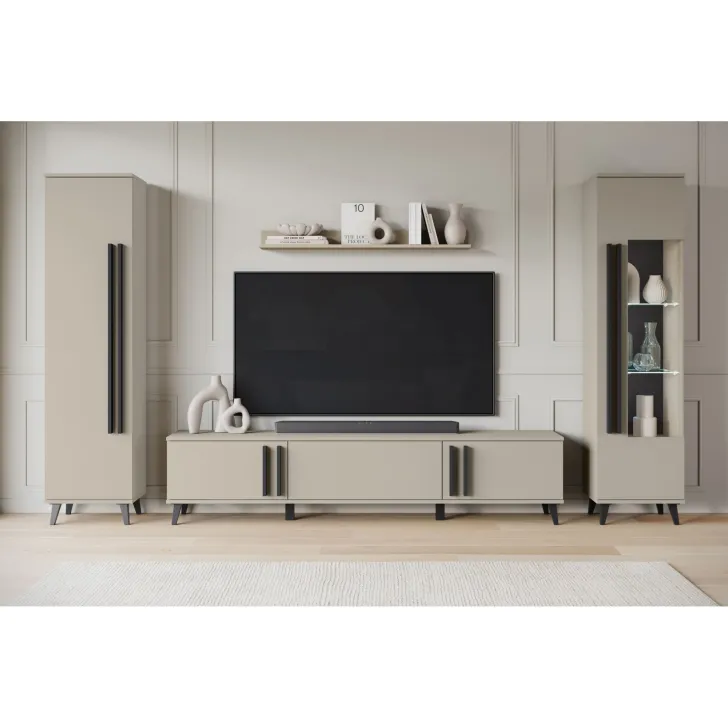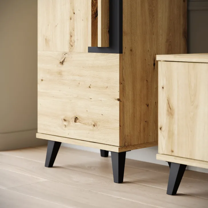 Odkryj elegancką ściankę meblową HURON II - estetyczny i praktyczny zestaw mebli do salonu. Zestaw mebli HURON II cechuje harmonijność i spójność. Jego geometryczne kształty łatwo wpasują się w różnorodne style wnętrza i podkreślą charakter każdej aranżacji. Na uwagę zasługują wyraziste lamelowe uchwyty i ukośne nóżki, które wprowadzają wyjątkowy akcent dekoracyjny.
