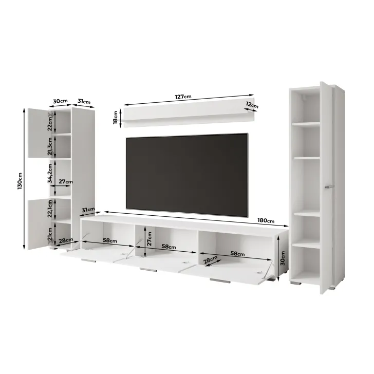 • Szafka RTV x 1 szt.: 180 x 30 x 31 cm (szerokość x wysokość x głębokość)