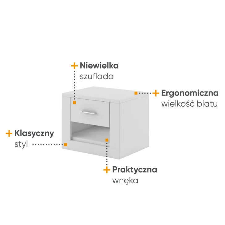 Dodaj do swojej sypialni nie tylko funkcjonalność, ale także klasykę i elegancję z naszym stolikiem nocnym ERTA 7 w kolorze białym. Idealnie zaprojektowany z myślą o Twojej wygodzie, stolik nocny ERTA ma wystarczająco dużą przestrzeń, aby pomieścić lampkę nocną, budzik i inne przedmioty, które chcesz mieć pod ręką.