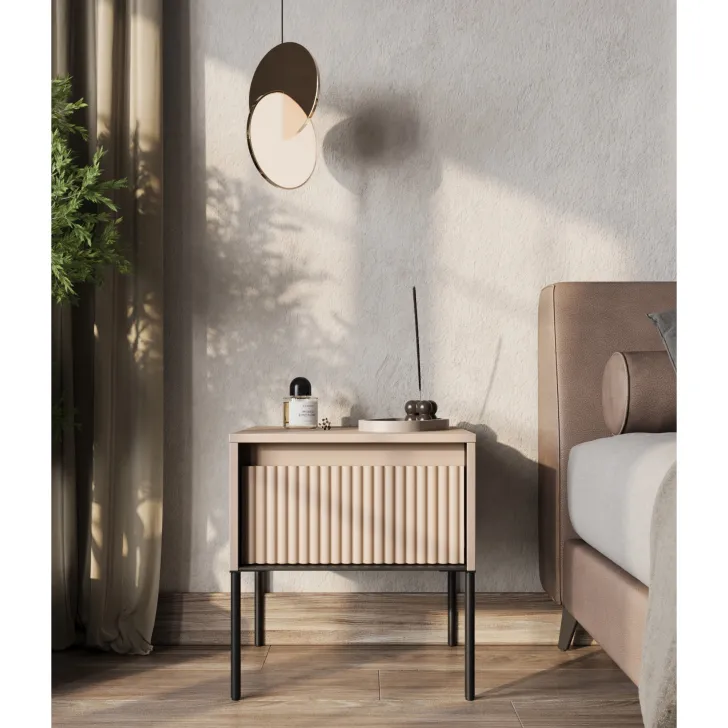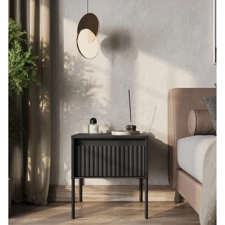 Nasza szafka nocna TREVIOLO jest wysoce funkcjonalna. Posiada pojemną szufladę na książki, czasopisma, telefon lub cokolwiek, co chciałbyś mieć pod ręką w nocy. Blat jest wystarczająco duży, aby pomieścić lampkę nocną, zdjęcie lub małe doniczki. Wysokie, smukłe nogi nadają mu niepowtarzalny akcent, dodający gustowne elementy do Twojego wnętrza.