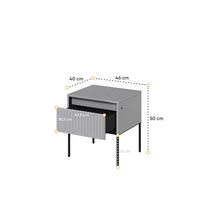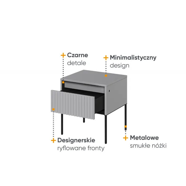 Nasz stolik nocny jest także łatwy w montażu, dzięki metalowym nogom. Prowadnica push-open dodaje mu nowoczesności i jeszcze większej funkcjonalności, umożliwiają natychmiastowy i łatwy dostęp do zawartości szuflady.