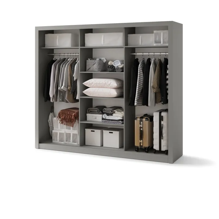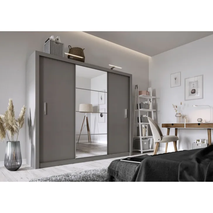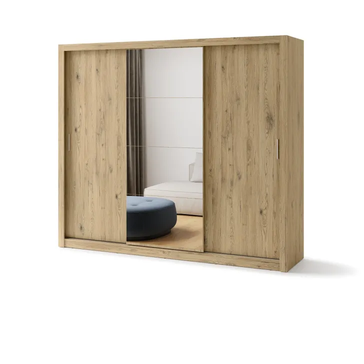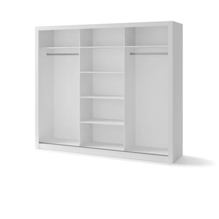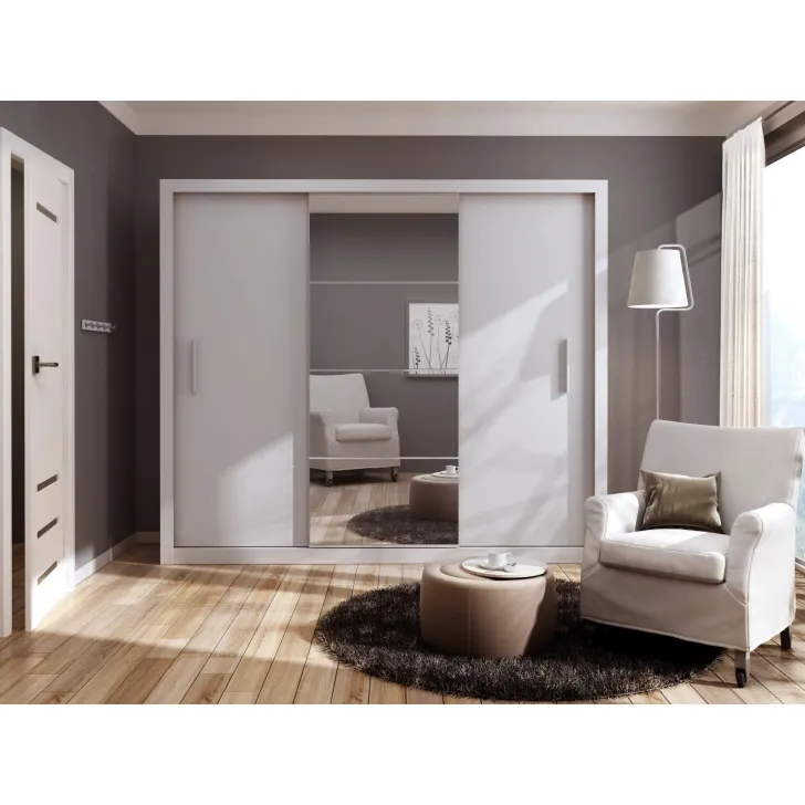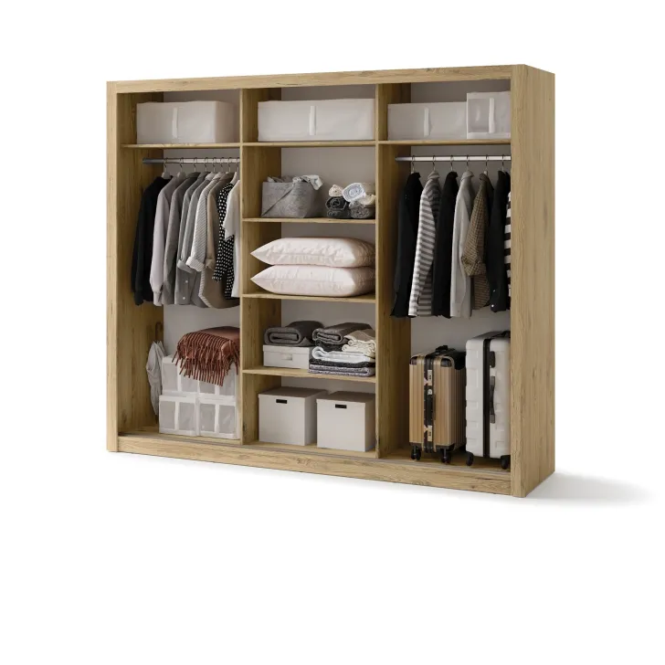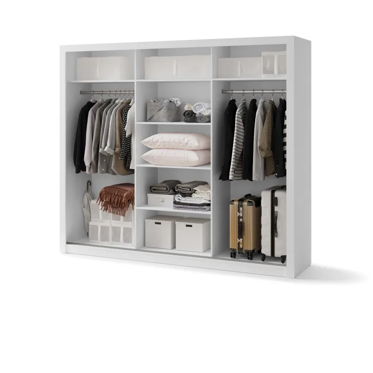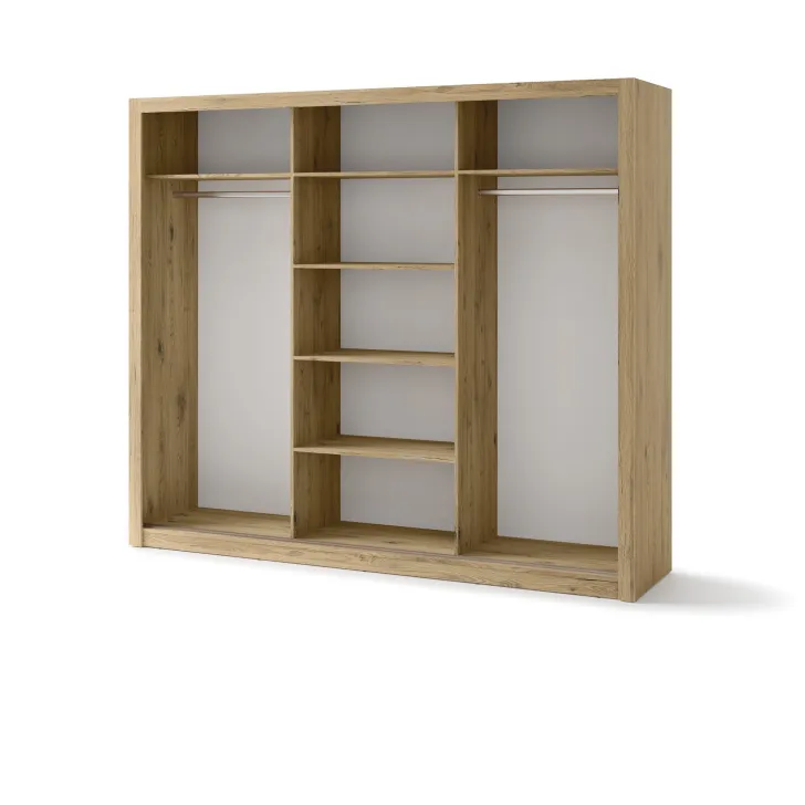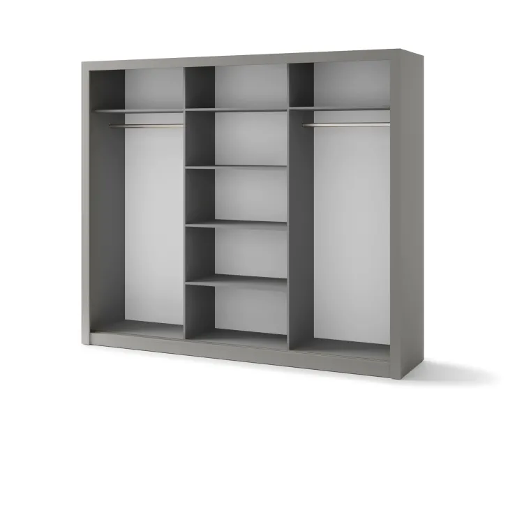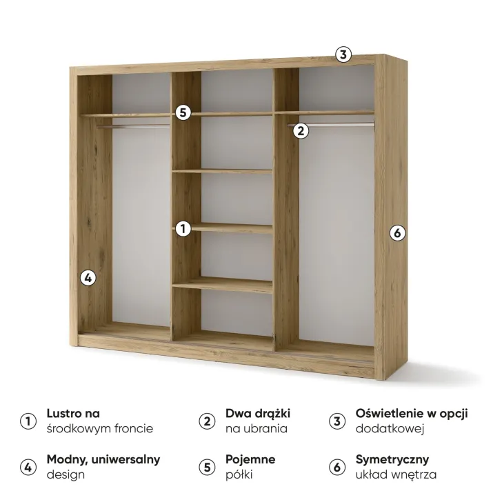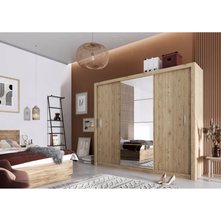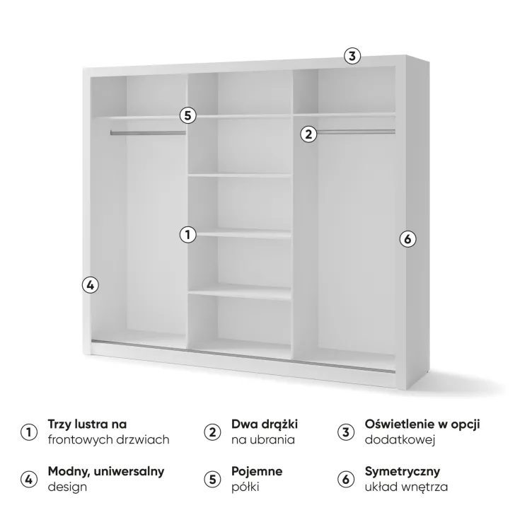 Szafa JADIA 1 to funkcjonalna odpowiedź na Twoje potrzeby organizacji przestrzeni. Niezastąpiony element każdego domu, stworzony z myślą o oszczędzaniu miejsca i systematycznym przechowywaniu ubrań oraz innych akcesoriów. Ta solidna, przestrzenna szafa z kolekcji JADIA, została zaprojektowana z troską o każdy, nawet najmniejszy detal. Wyposażona w trzy praktyczne drzwi przesuwne oraz wewnętrzne lustra, które dodatkowo optycznie powiększają przestrzeń. Co więcej, Szafa JADIA 1 posiada dwie praktyczne szyny na wieszaki i sześć obszernych półek, które pomieszczą wszystko, czego potrzebujesz, umożliwiając zachowanie perfekcyjnego porządku. Poniżej prezentujemy kilka ważnych cech, które wyróżniają ten model: