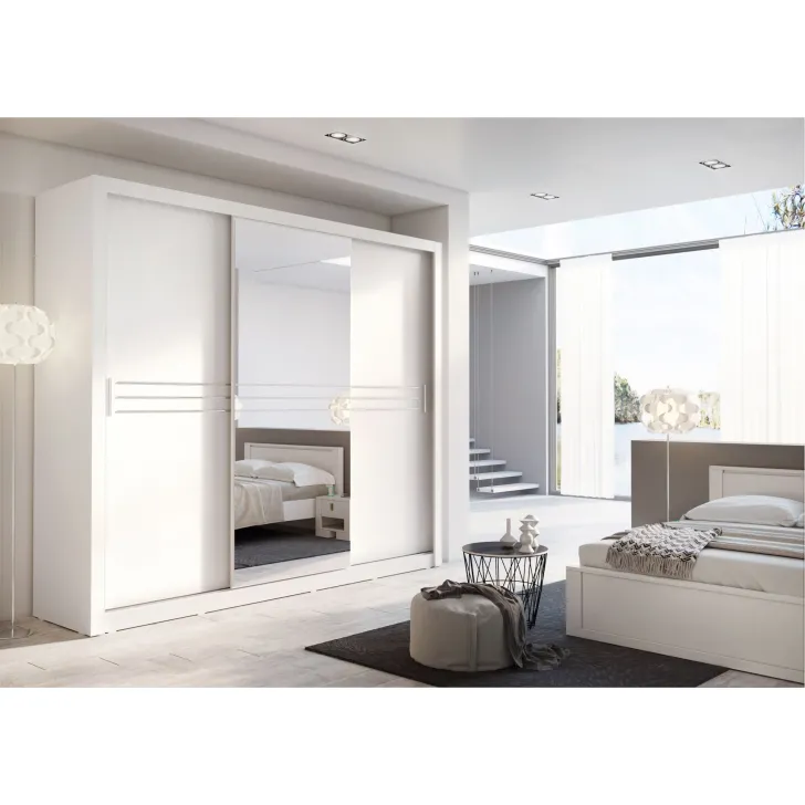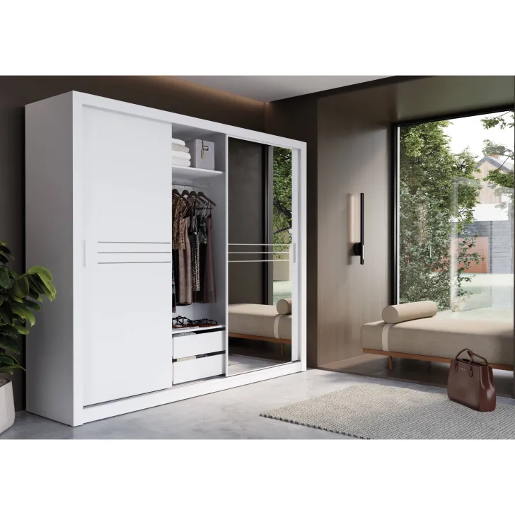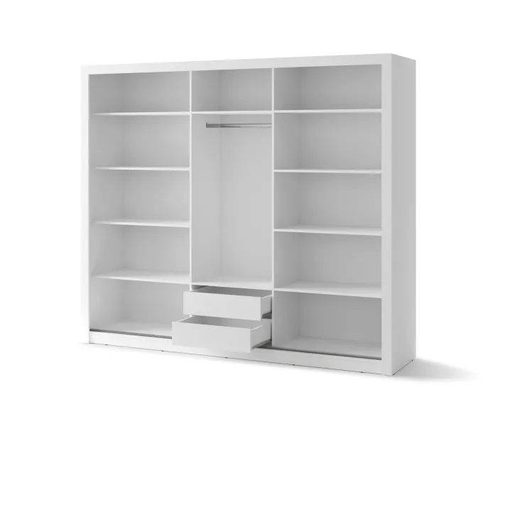 Szafa JADIA 11 posiada dwoje drzwi przesuwnych, które gwarantują łatwy i wygodny dostęp do zawartości. Na froncie jednych drzwi umieszczone jest duże, praktyczne lustro, które nie tylko jest niezastąpionym elementem w garderobie, ale także optycznie powiększa przestrzeń i wprowadza do pomieszczenia więcej światła. Wewnątrz mebla zaprojektowano przyjazny i najbardziej funkcjonalny układ – drążek na wieszaki oraz dwa wewnętrzne regały z półkami.