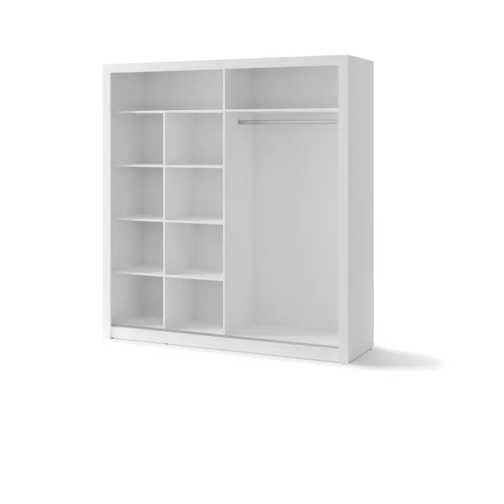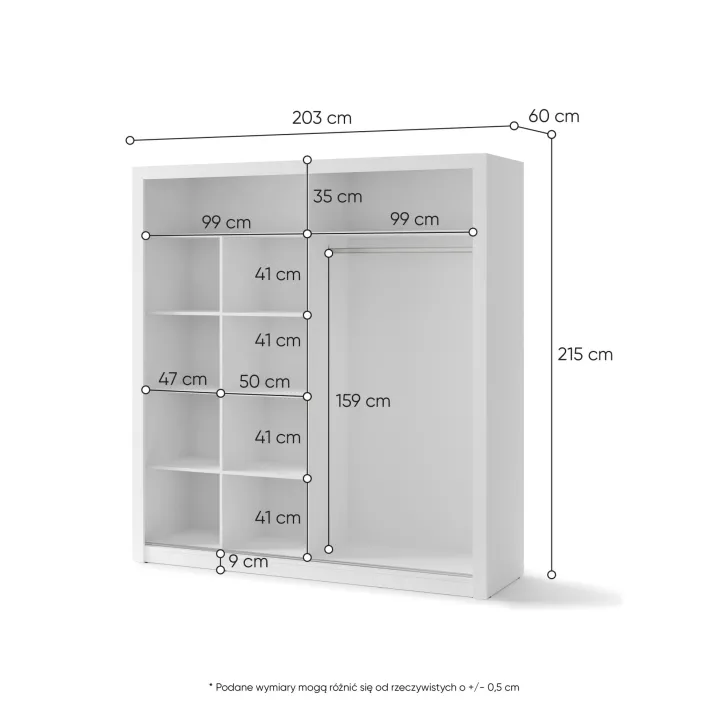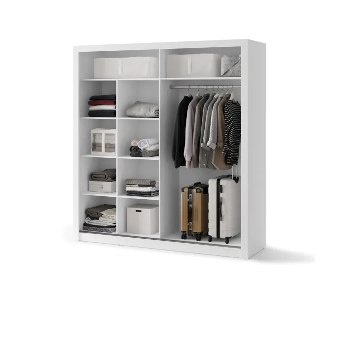• Funkcjonalność: Posiada drążek na wieszaki, dwie szuflady do przechowywania bielizny i dwa wewnętrzne regały z półkami, co znacznie ułatwia porządkowanie.