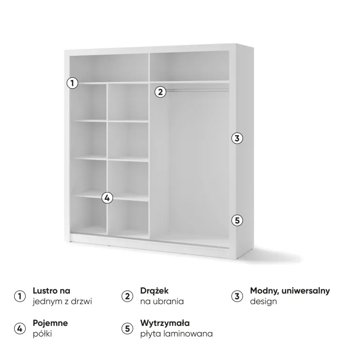 Szafa JADIA 12 biała spełnia wszystkie oczekiwania najbardziej wymagających poszukiwaczy funkcjonalnych i estetycznych rozwiązań wnętrzarskich. Ta pojemna szafa z kolekcji JADIA jest nie tylko niezbędnym elementem wyposażenia każdego domu, ale prezentuje się stylowo, dodając elegancji każdemu pomieszczeniu. Kiedy przechowywanie ubrań i akcesoriów staje się wyzwaniem, Szafa JADIA 12 biała przychodzi z pomocą. Dzięki przemyślanej konstrukcji i obszernej przestrzeni, pomieści wszystko co niezbędne, utrzymując jednocześnie porządek w Twoim wnętrzu. Szafa JADIA zachwyca minimalistycznym wyglądem oraz uniwersalnym wybarwieniem, które znakomicie dopełnią każde wnętrze urządzone zarówno w nowoczesnym, jak i klasycznym stylu. Duża i pojemna szafa JADIA 12 z trojgiem drzwi przesuwnych to kombinacja atrakcyjnego designu i funkcjonalności. Na froncie jednych drzwi znajduje się lustro - niezbędny element każdej garderoby, który optycznie powiększa wnętrza i wprowadza do pomieszczenia więcej światła. Wnętrze szafy kryje funkcjonalny układ - drążek na wieszaki oraz dwa wewnętrzne regały z półkami, a także dwie wewnętrzne szuflady - idealne do przechowywania bielizny.