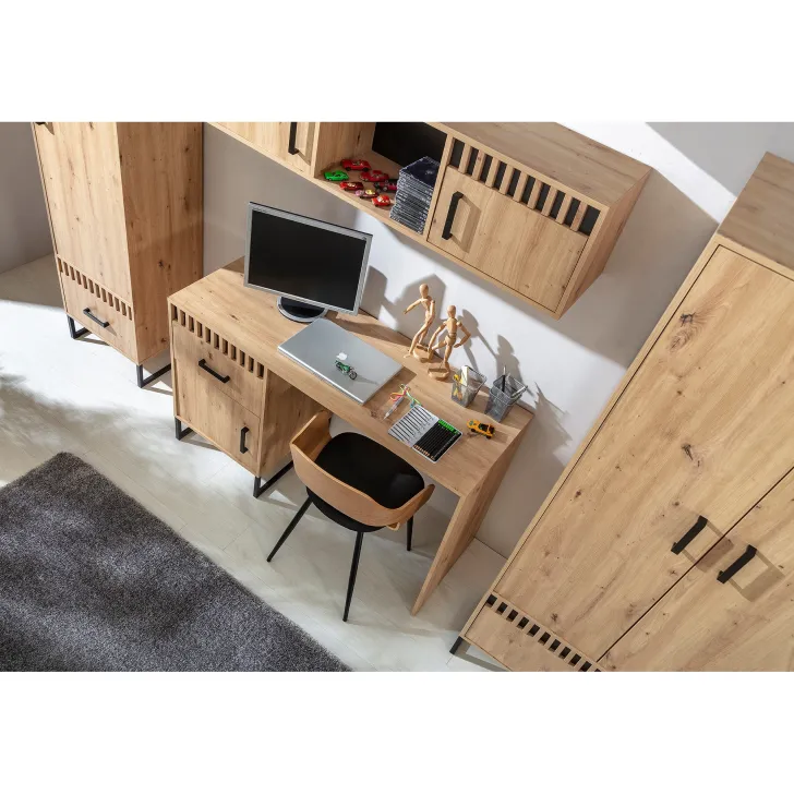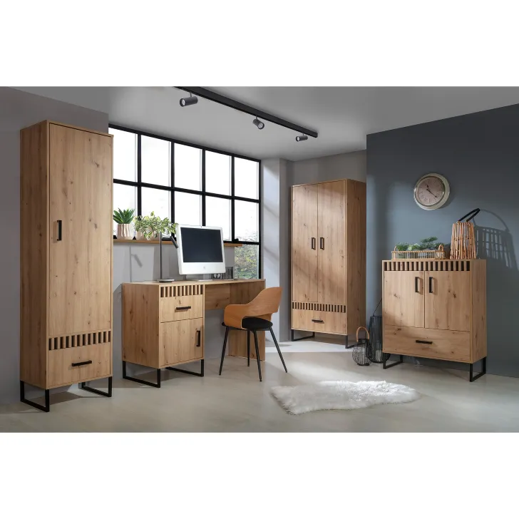 Wyrównując równowagę między stylem i funkcjonalnością, Szafa MELLE 1 stoi na wymyślnie zaprojektowanych metalowych nóżkach, które dodają lekkości całej konstrukcji. Prosty, ale efektowny design w kolorystyce dąb artisan podkreślają czarne metalowe nogi i uchwyty, nawiązując do modnego w ostatnich latach stylu loftowego.
