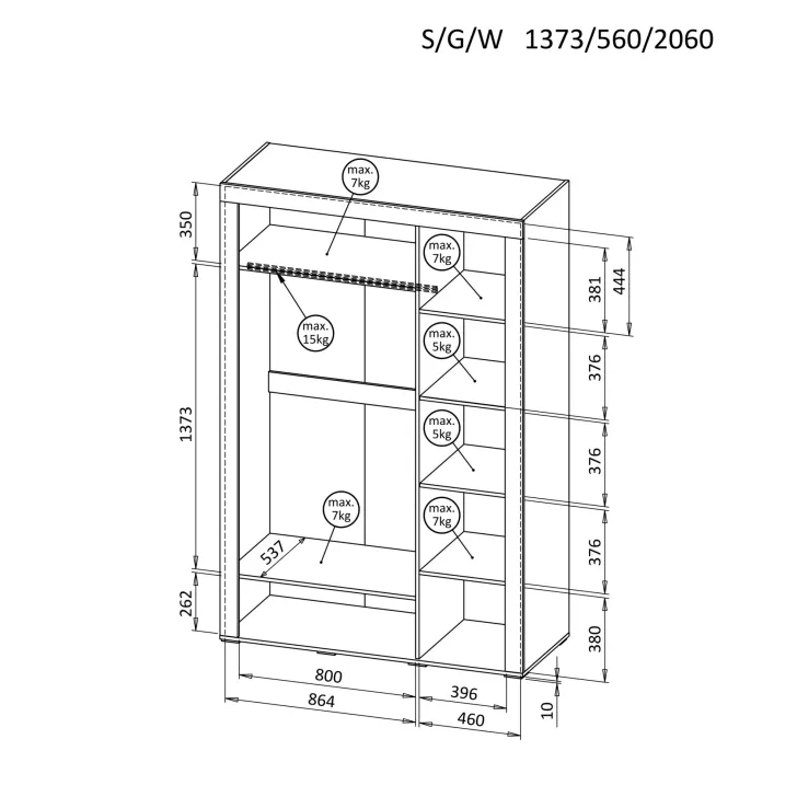 Nowoczesna i pojemna konstrukcja umożliwia przechowywanie wszystkiego, co chcesz ukryć przed wzrokiem ciekawskich. Wyposażona w metalowy drążek na ubrania (maks. obciążenie do 15 kg) i półki za drzwiami, zapewnia dużą przestrzeń do przechowywania.