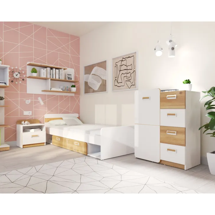 Wykonana z wysokiej jakości płyty meblowej, ta szafka nocna zapewnia niezrównaną trwałość i wytrzymałość. Jej powierzchnia pokryta jest laminatem, który oprócz swojego wyglądu, pełni również funkcję ochronną, dzięki czemu mebel długo zachowa swój nienaganny wygląd. Równie ważne są detale. Krawędzie szafki są pokryte obrzeżem ABS, które chroni mebel przed uszkodzeniami, a uchwyt z tworzywa sztucznego dodaje szafce subtelnego wdzięku i ułatwia jej otwieranie.