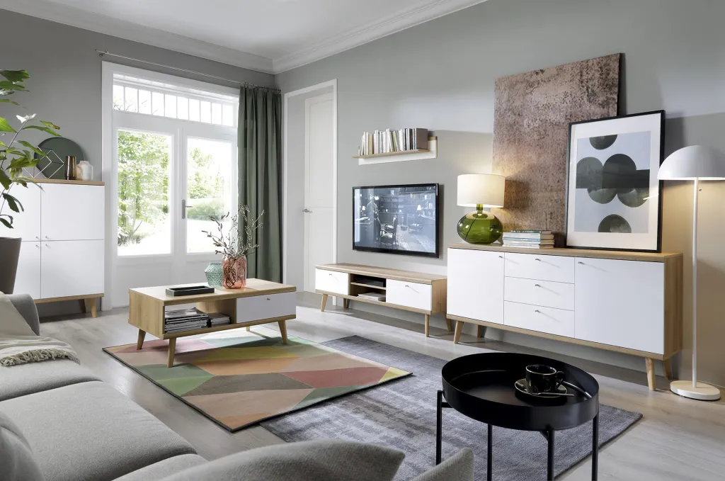 - Kompozycja ciepłego dębu riviera i klasyki bieli