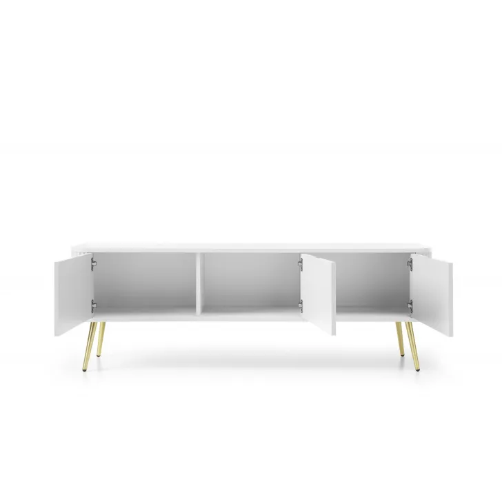 Nie tylko piękna, ale także praktyczna. Szafka RTV ZOYA posiada pojemne wnętrze, przedzielone na trzy części, które skrywają się za solidnymi drzwiami z płyty MDF. To pozwala na łatwy dostęp do przechowywanych przedmiotów i sprzętu RTV.