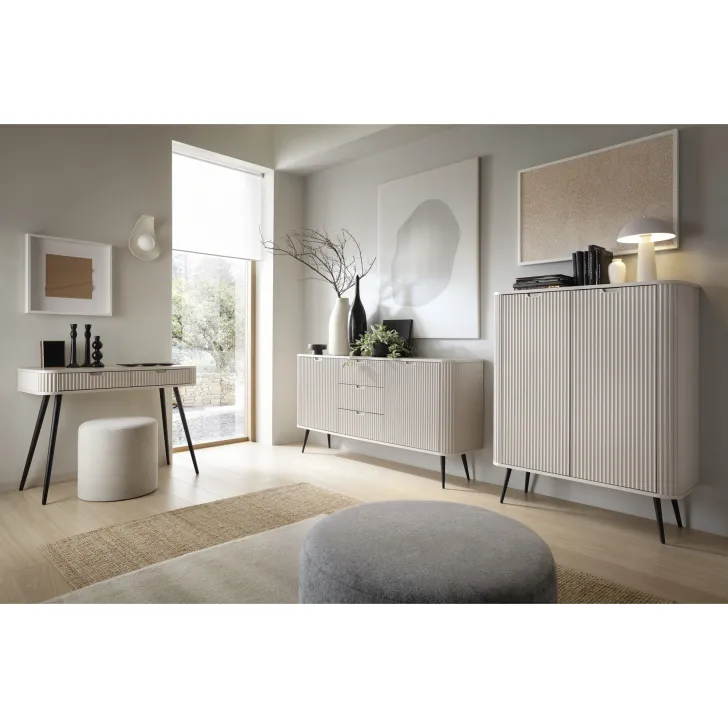 Szafka RTV ZOYA to połączenie klasycznej elegancji z modernistycznym designem. Jej kolor, w połączeniu z unikalnym, ozdobnym frontem wykonanym z MDF, stwarza harmonijne i minimalistyczne połączenie, które odświeży każde wnętrze, nadając mu nowego, stylowego wyglądu.