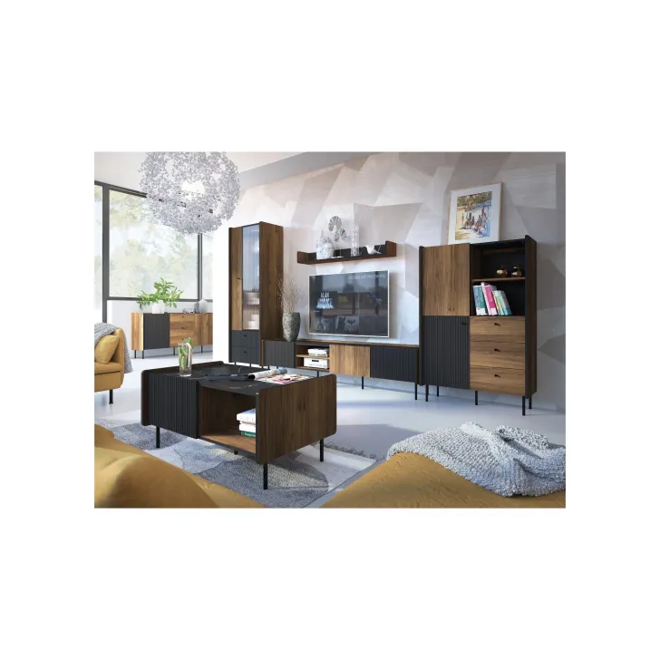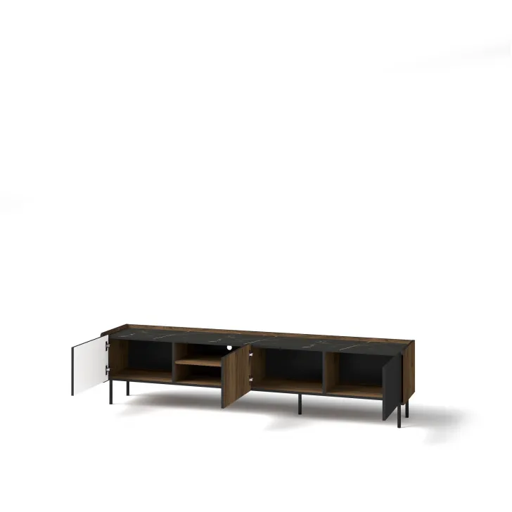 - Funkcjonalność: Szafka RTV oferuje wiele miejsca do przechowywania z otwartymi wnękami i półkami na całej długości, co daje wiele możliwości przechowywania i dekoracji.