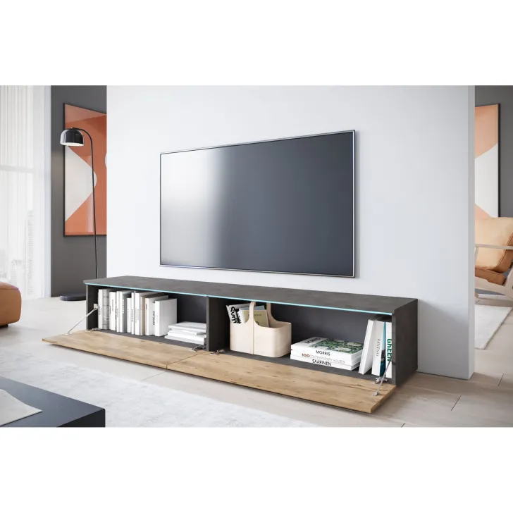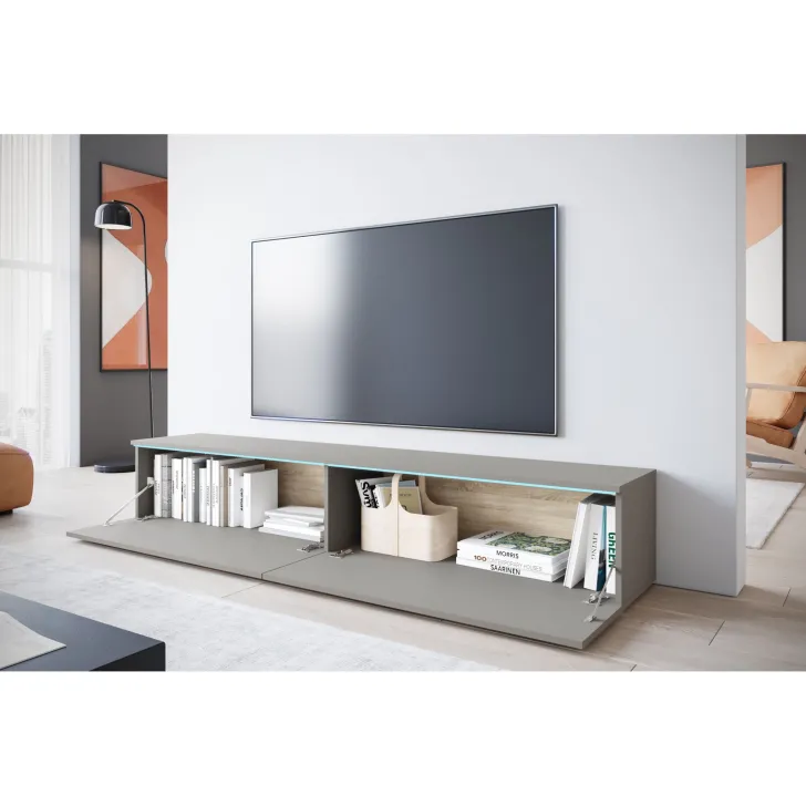 Niewątpliwie, jednym z największych atutów Szafki RTV DONNA 180 cm jest jej praktyczność. Wygodne przechowywanie sprzętu RTV oraz drobnostek jest możliwe dzięki dwóm schowkom, ukrytym za drzwiami otwieranymi z góry do dołu w systemie klap. To doskonałe rozwiązanie do przechowywania nie tylko sprzętu RTV, ale także zdjęć, pudełek, które zawsze gubią się po domu.