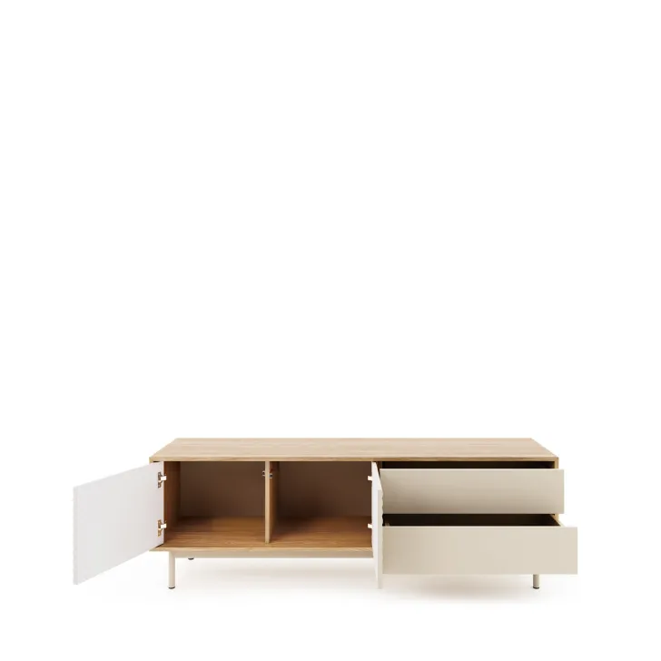 Szafka RTV LITA 4 charakteryzuje się minimalistycznym designem z doskonałą grą faktur na frontach drzwi. Ryflowane drzwiczki kryją dwa niezależne od siebie schowki, a szuflady z gładkimi frontami pomieszczą drobniejsze rzeczy. Zestawienie kolorów kaszmir i dąb olejowany, ryflowane fronty, metalowe wysokie nóżki i wbudowane oświetlenie LED tworzą wyjątkową, wyważoną całość z dopracowanymi szczegółami.