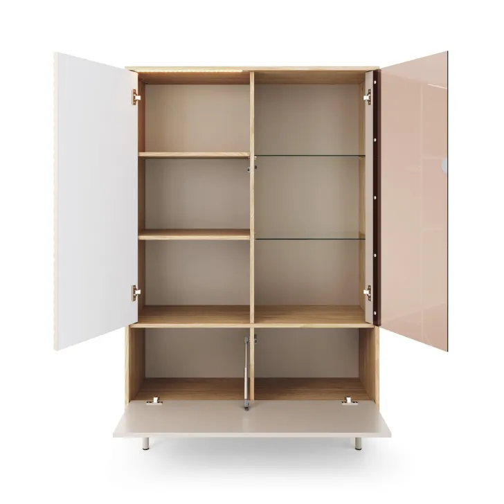 Zastosowany w tej witrynie bezuchwytowy system otwierania Push to open zapewnia komfort użytkowania. Dodatkowo, dla tych, którzy cenią sobie przytulną atmosferę, dostępna jest opcja mebla z oświetleniem szklanych półek.