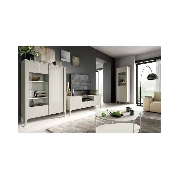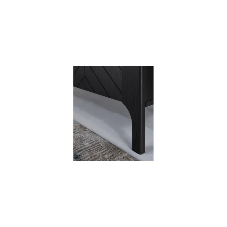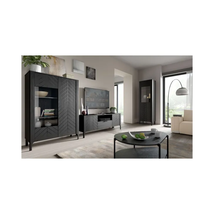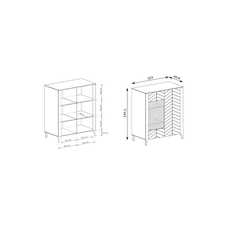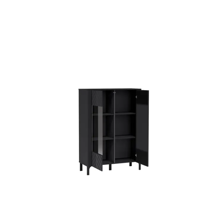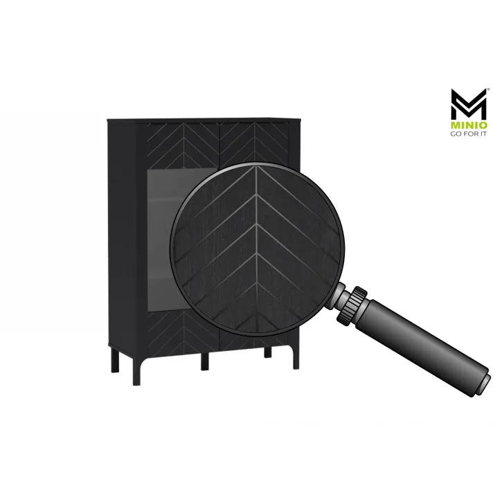 Witryną wykonano z wysokiej jakości płyty laminowanej, a jej unikalne fronty zdobi wzór jodełki. Czy możesz sobie wyobrazić, jak taki efekt wizualny doda Twojemu wnętrzu przytulności? W połączeniu z dostępnymi kolorami: czarnym Painflow i kaszmirem, ten mebel naprawdę przyciągnie wzrok.