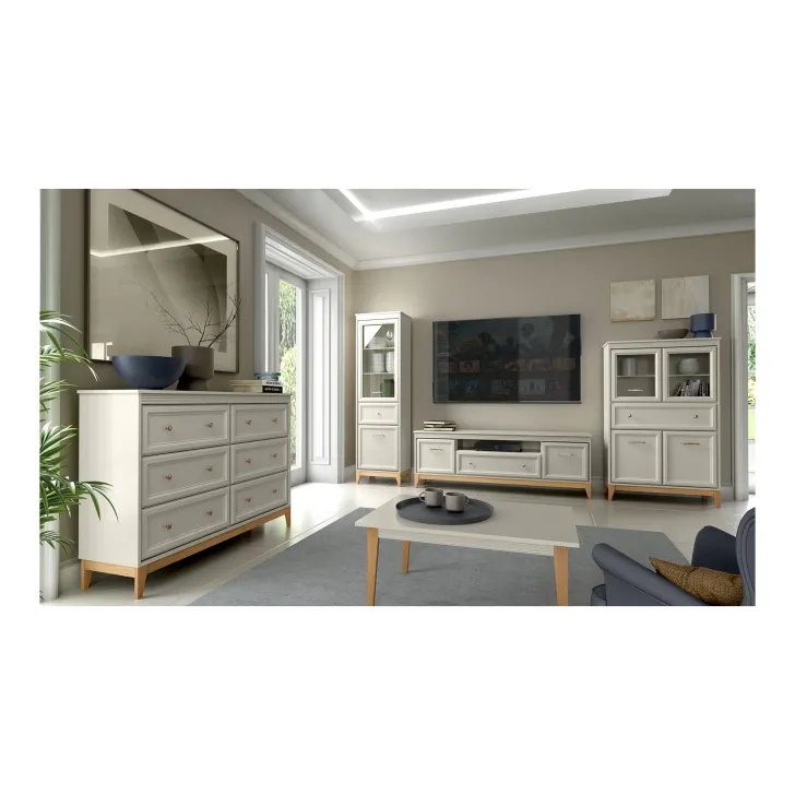 Wykonany z wysokiej jakości płyty laminowanej korpus mebla oraz fronty z płyty MDF z dekoracyjnymi listwami nadają lekkości konstrukcji, mim zapewnienia pełnej stabilności. Nogi z litego drewna dębowego gwarantują trwałość i absolutnie naturalne piękno. Stylowe, metalowe uchwyty w kolorze miedzi to detal, który nie tylko podkreśla jeszcze bardziej charakter mebla, ale też dodaje mu wyszukanego uroku. Stosując opcjonalne oświetlenie LED dla półek w przeszklonej części witryny, zyskujemy możliwość stworzenia nastrojowej atmosfery w naszych wnętrzach.