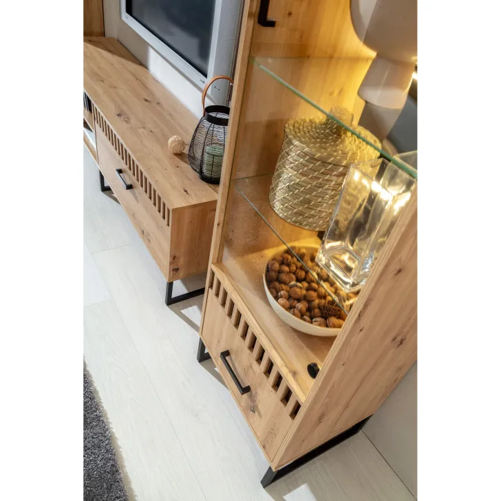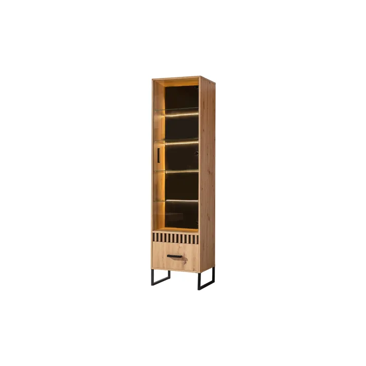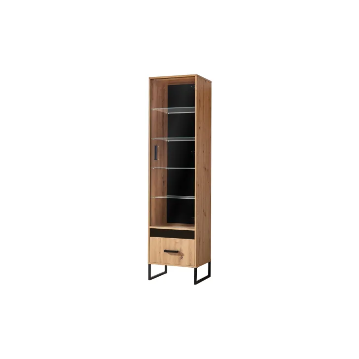 Wysoka witryna MELLE 3 wyróżnia się twórczym designem. Wyposażona jest w dwie wstawki - jedną czarną gładką, drugą zdobioną listwami MDF tworzące modny wzór lameli, z których możesz wybrać podczas montażu. Czarne metalowe nóżki, uchwyty oraz tylna płyta HDF w czarnym kolorze podkreślają prawdziwie loftowy styl tego produktu utrzymanego w subtelnej kolorystyce dąb artisan.